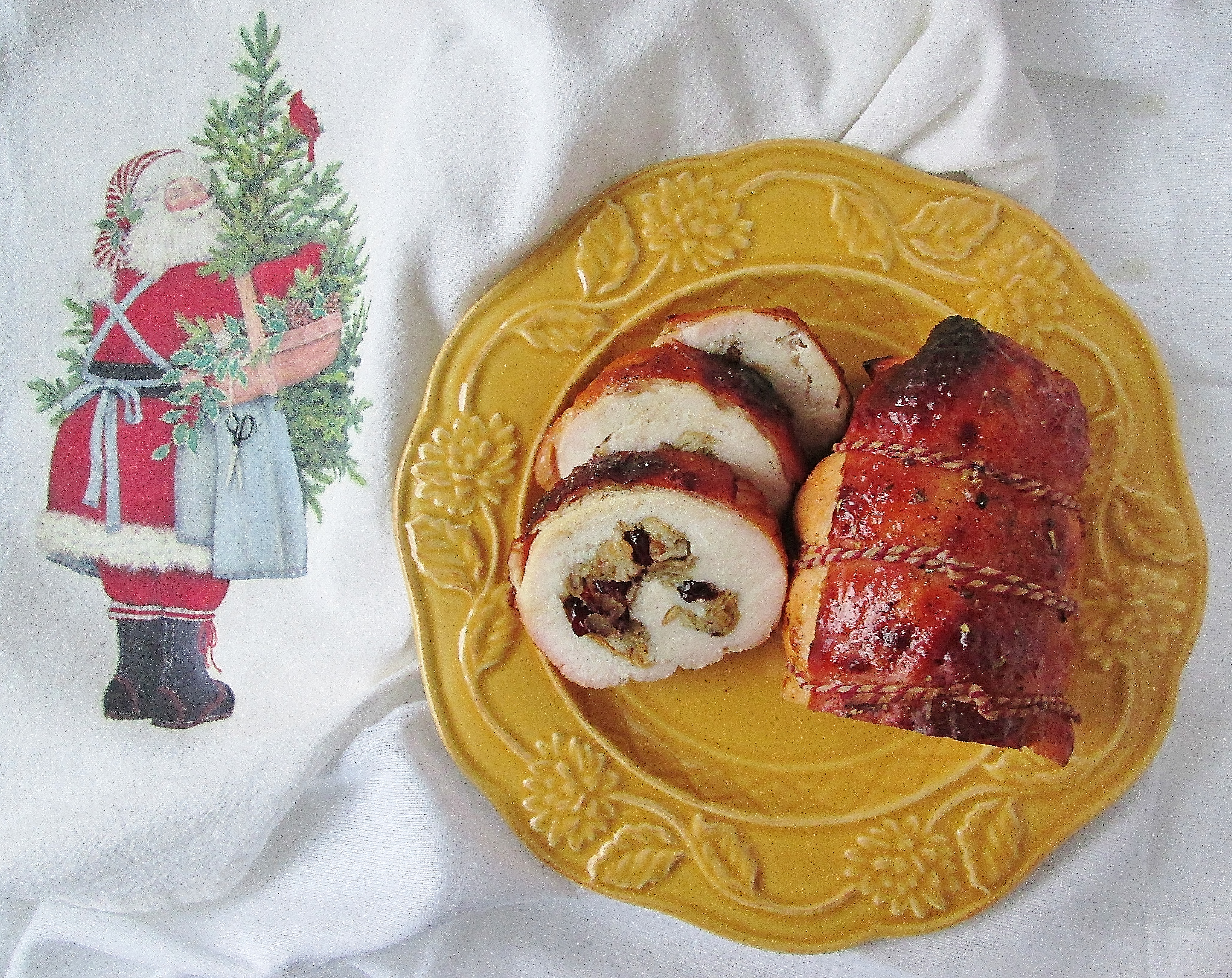 Using the roulade recipe as inspiration, I made some key changes to make this recipe unique: wrapping the turkey in bacon, swapping apples for pears and pecans for walnuts, changing bread cubes to Panko crumbs, and adding onion. Plus, I swapped out the seasonings for the thyme and rosemary you’d typically find in stuffing.
