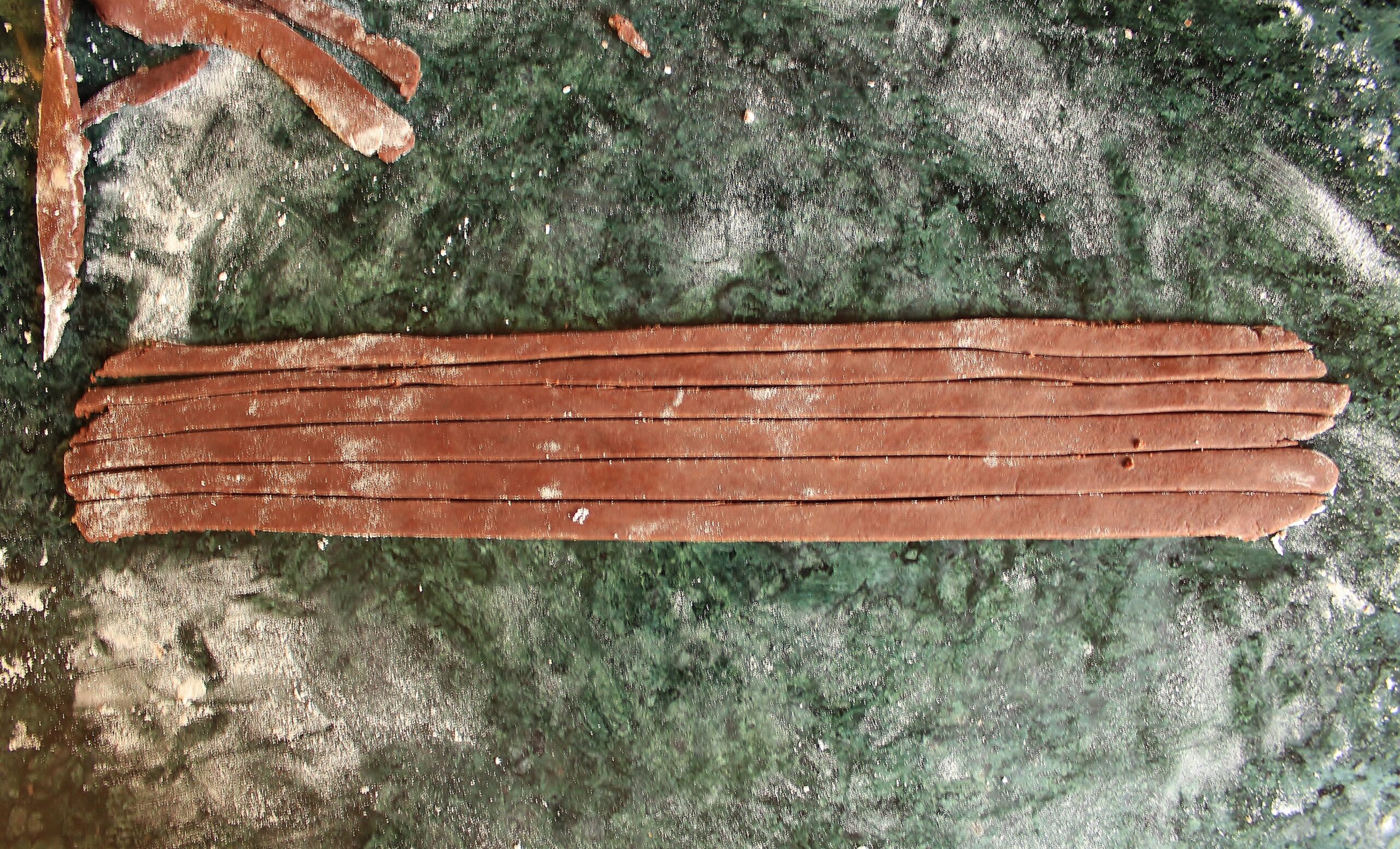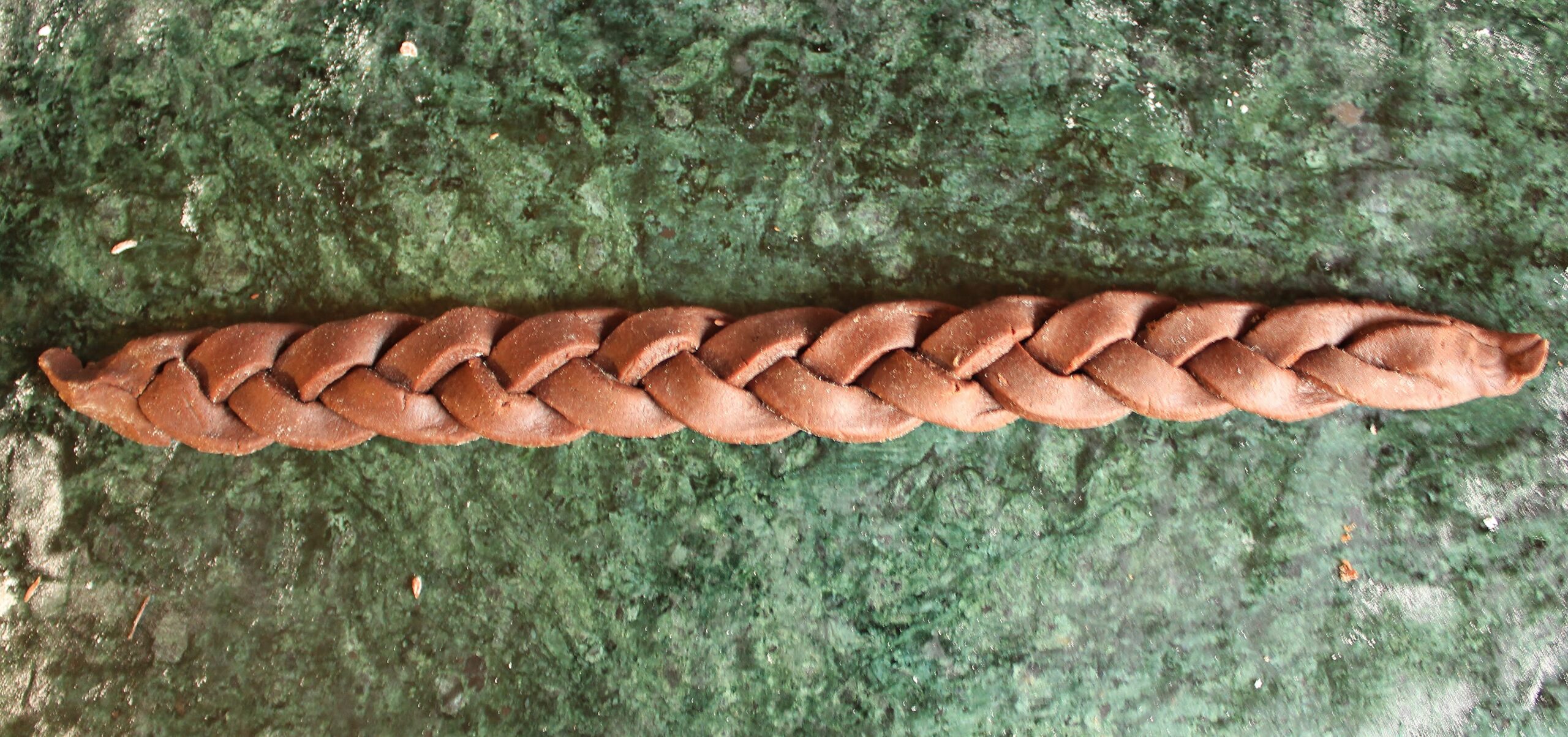 - Roll out your dough on a lightly floured surface until is is about 14 inches across and lay it into a 9-inch pie tin. Trim the edges to fit. Gather the trimmings into a ball and roll it with your hands into a 4-inch long tube. Reflour your surface and roll the tube until it is about 13 inches long and 2 inches across. Trim into a rectangle with straight edges and set the trimming aside. Cut your rectangle into 6 long strips of equal length, about 1/4-inch across. Gently braid the strips into 2 3-plait braids. To reduce gaps, gently press the edges of the braid together as you go. Roll the trimmings into 4 balls of equal size (mine were about the size of a marble).