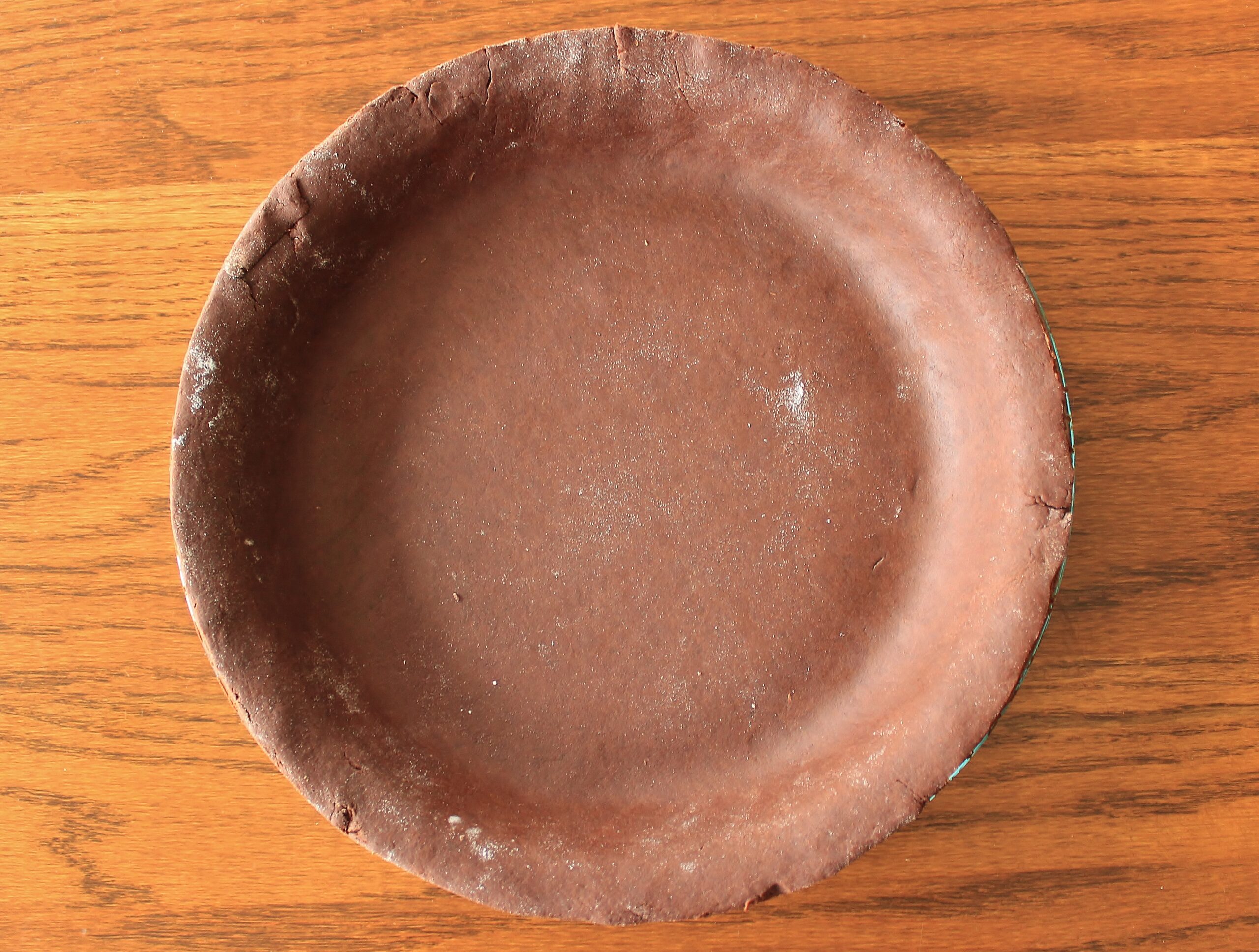 - For the Pie Dough: In a food processor, pulse the flour, cocoa powder, salt, and sugar until combined. Add the cubed butter a few tablespoons at a time, processing on low after each addition until well combined. Continuing to process on low, add the water 1 tablespoon at a time until the mix holds together when pressed with fingers but isn’t soggy (you might not use all the water).
