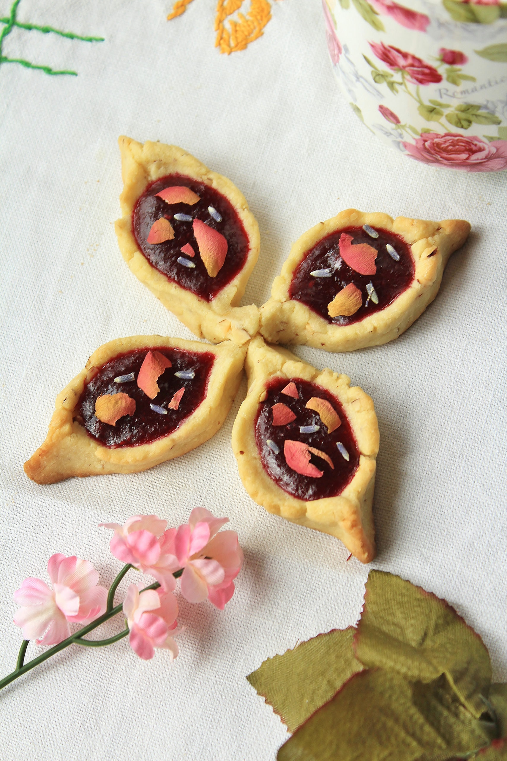 - Fill each indentation with 1/2 tsp raspberry lavender jam. To decorate, sprinkle crushed edible dried flowers or sprinkles over the jam. Allow to cool completely on the rack.