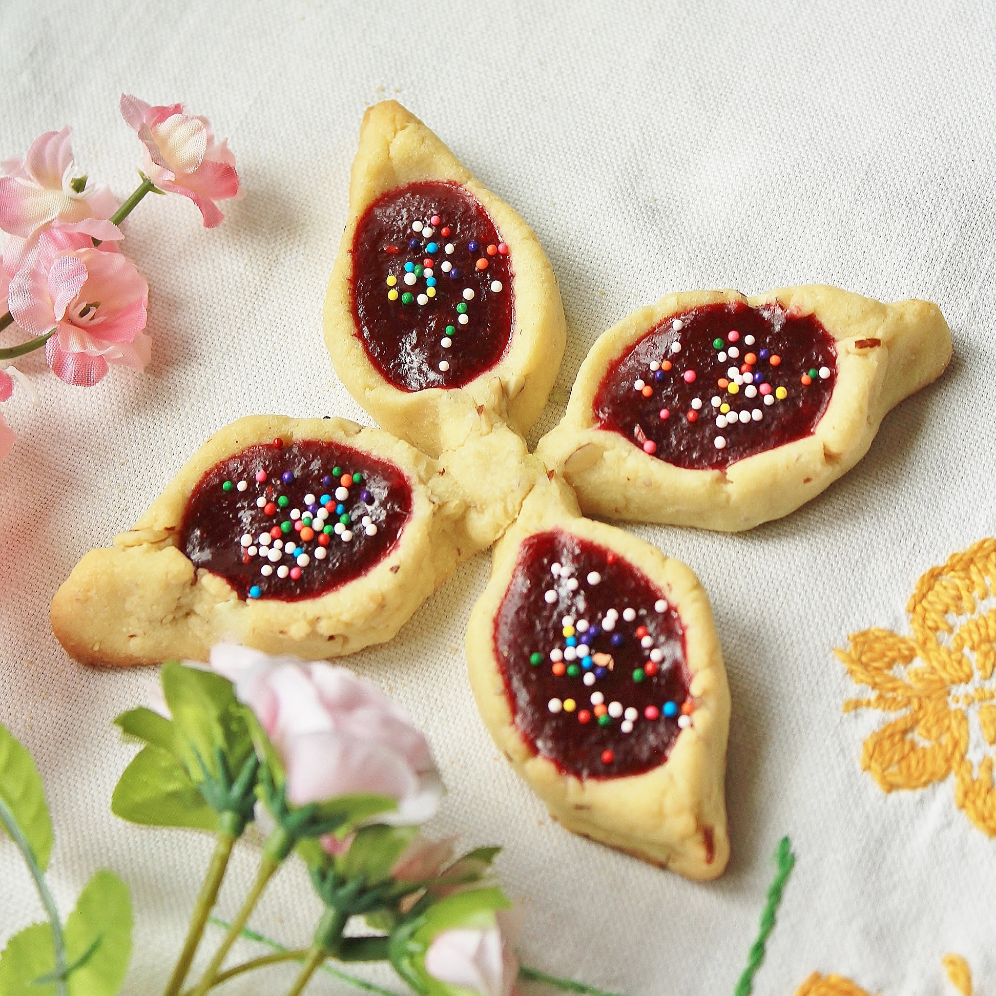 As I tried to figure out a way to incorporate flowers into the recipe (since Thumbelina marries the king of the flowers), I thought of switching the topping to homemade floral jam. Then it hit me: THUMBprint cookies!