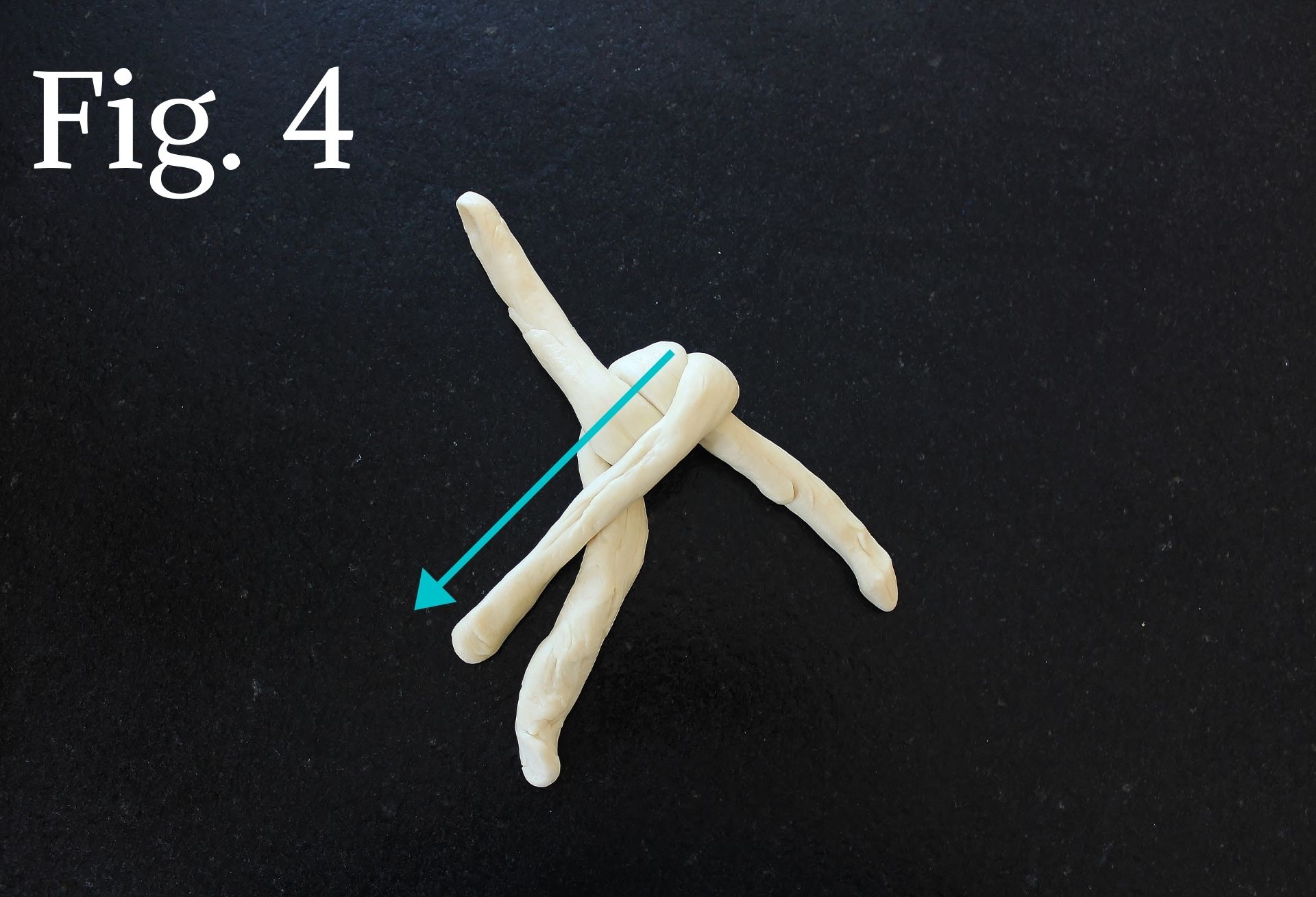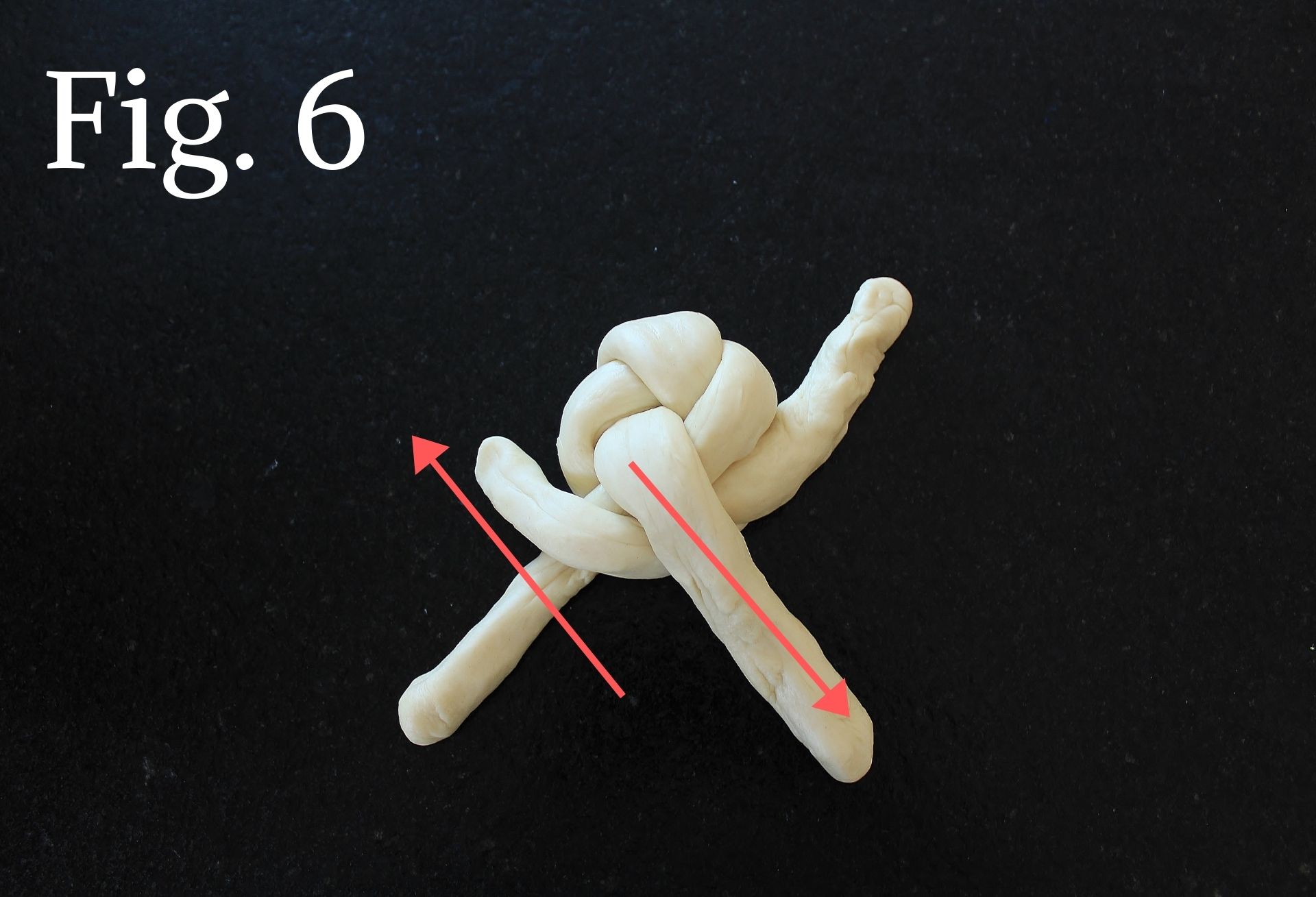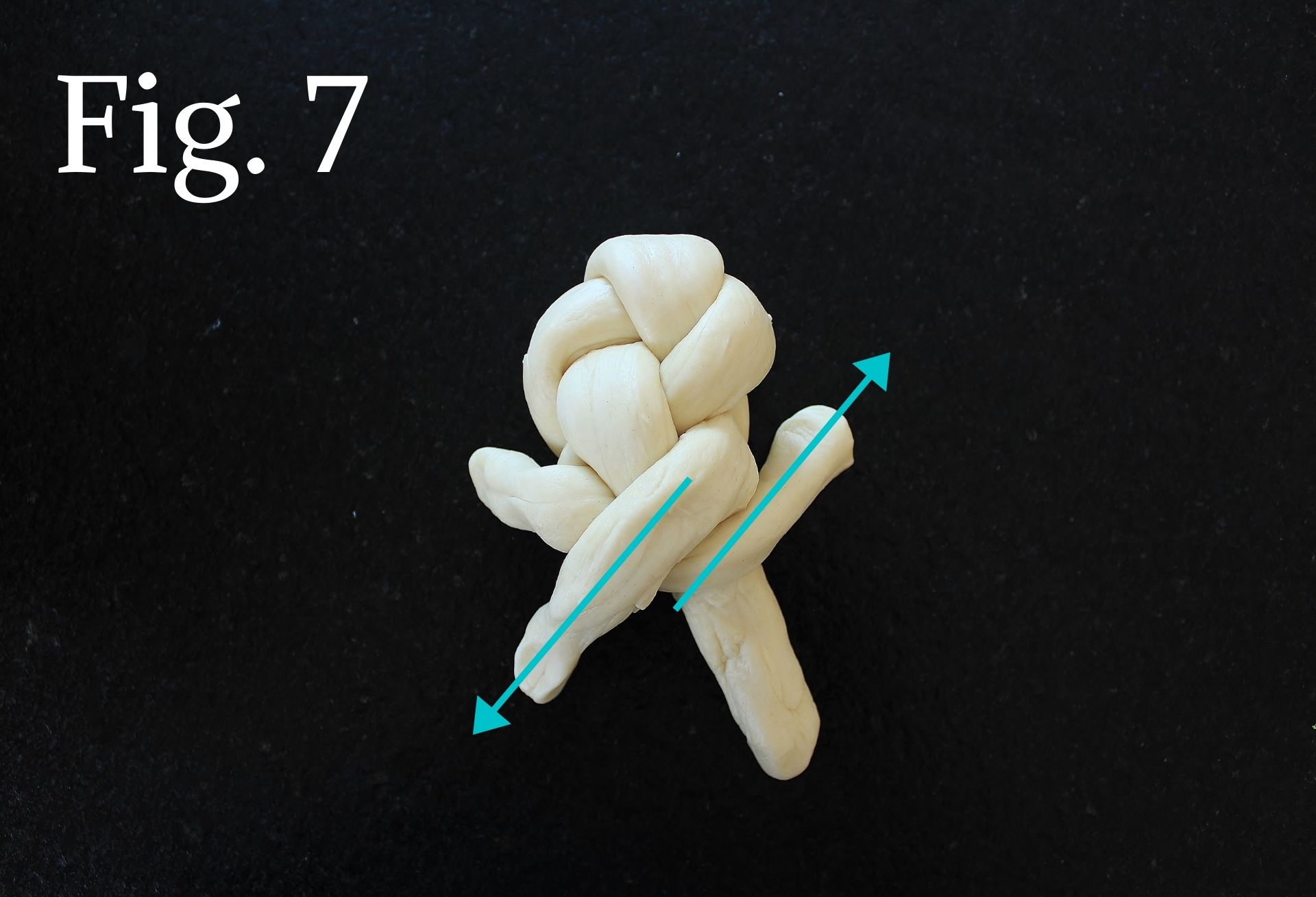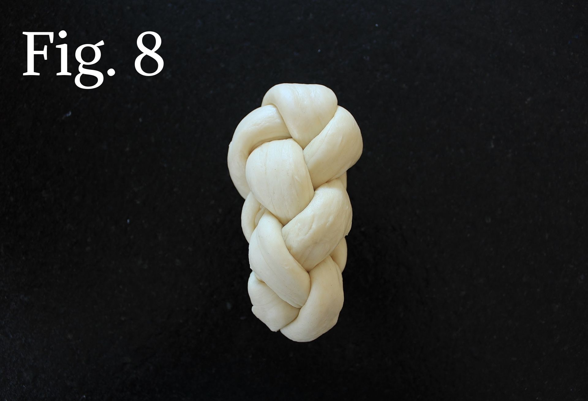 - Repeat Step 6 until you are out of dough (Fig. 6-7). Tuck the ends under the roll and pinch to keep in place (Fig. 8). The finished braid should be about 4 inches long and slightly tapered at one end (the taper is traditional).