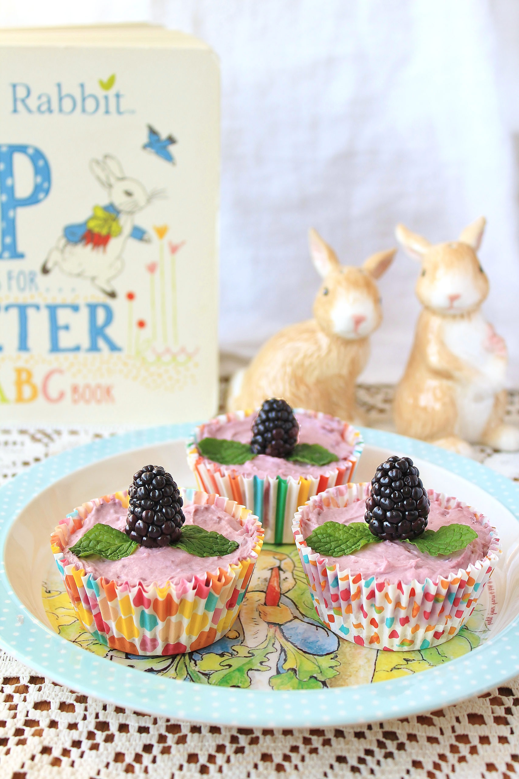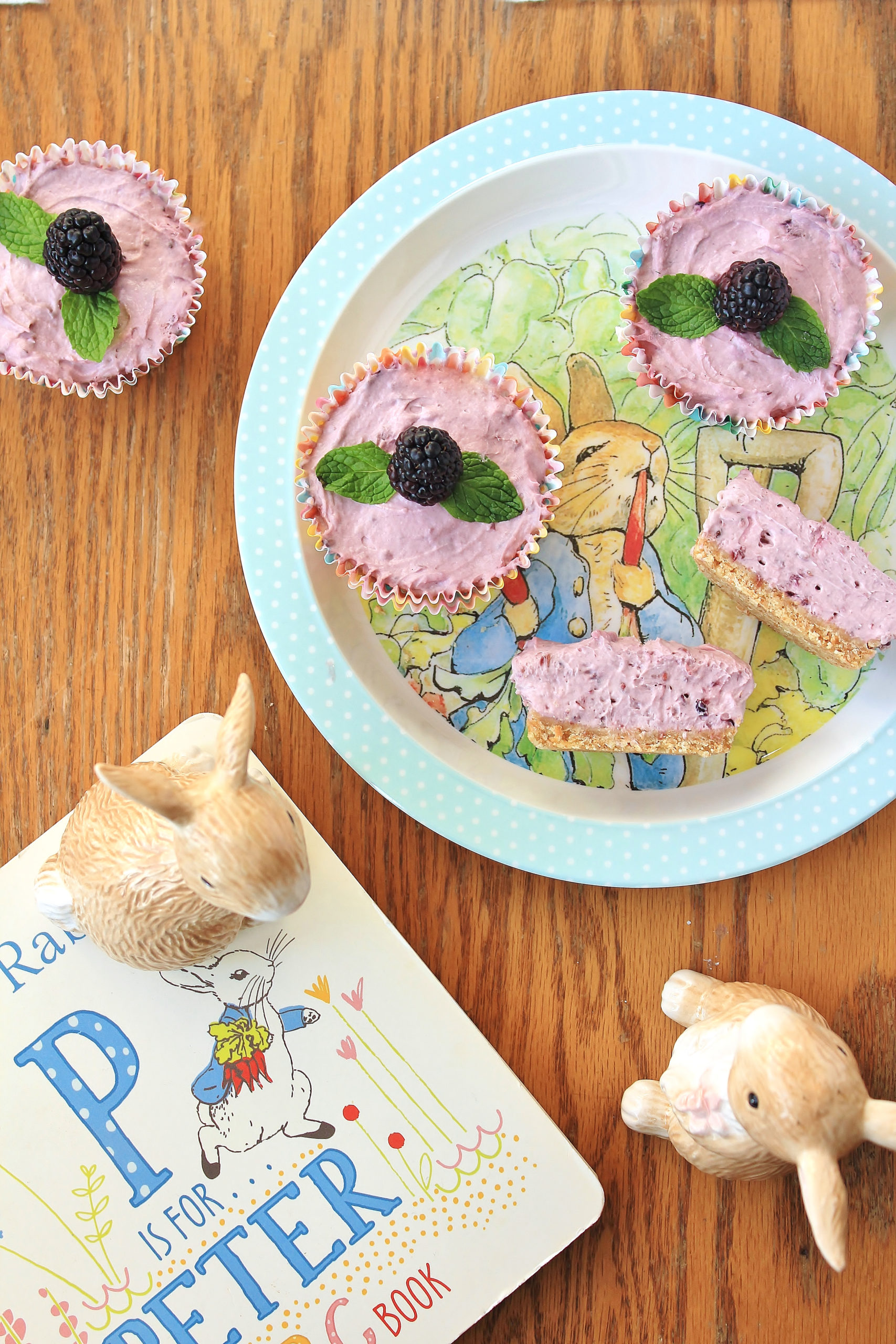 For the last dish in my PETER RABBIT menu, let me introduce you to these sweet little bites of heaven: mini no-bake blackberry cheesecakes! As soon as I started planning my menu, I knew I wanted the dessert to draw from the blackberries and milk Peter’s siblings enjoy at the end of the story. I tossed around lots of ideas, eventually deciding on no-bake cheesecake because my daughter loves cream cheese (her egg allergy prevents her from enjoying regular cheesecake). Plus, cheesecake is one of my husband’s favorite desserts. I made several batches during recipe testing, and he LOVED being my guinea pig! 😀
