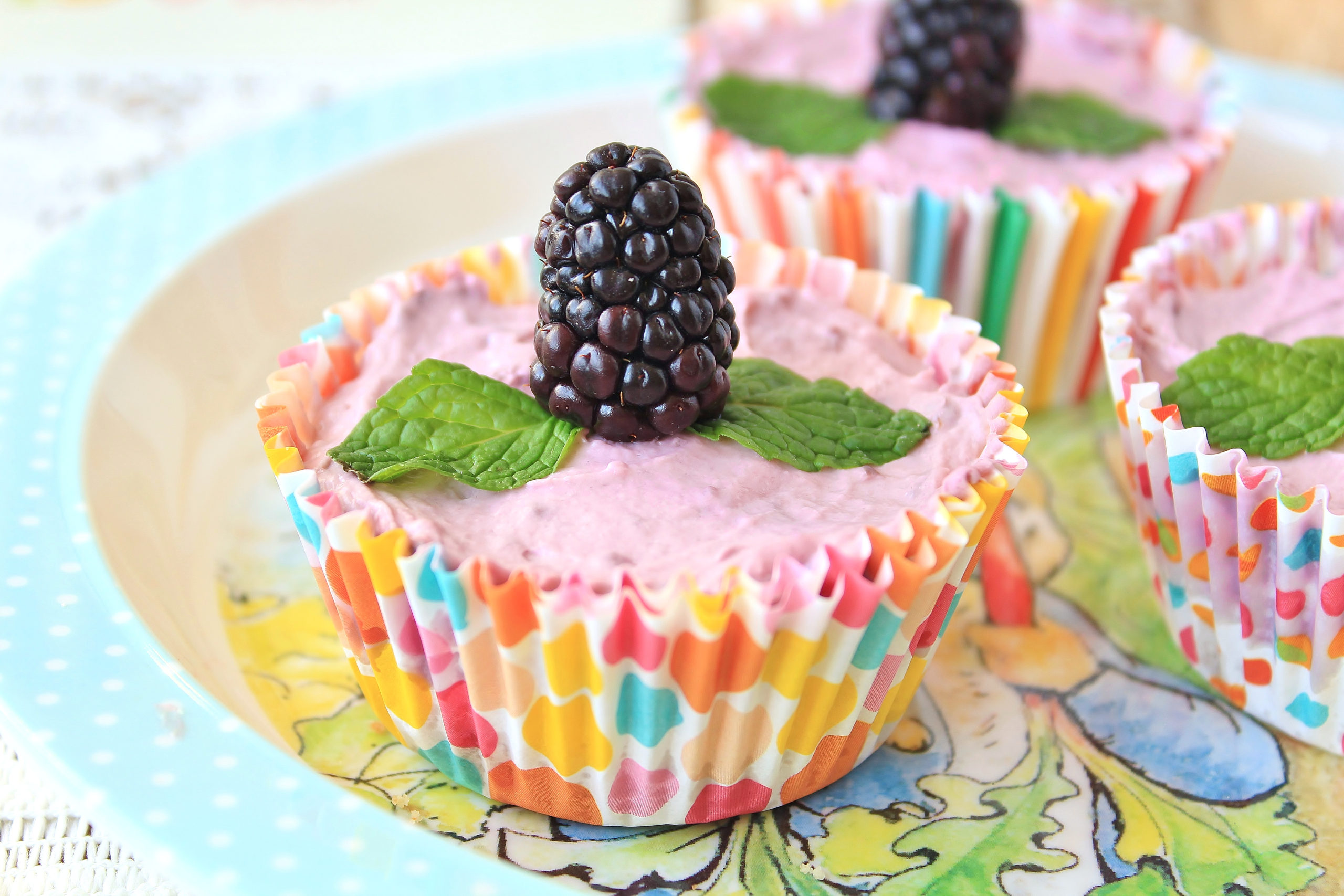- Spoon the filling into the prepared cupcake liners and smooth flat. Chill for 4 hours or overnight. Top with blackberries and mint.