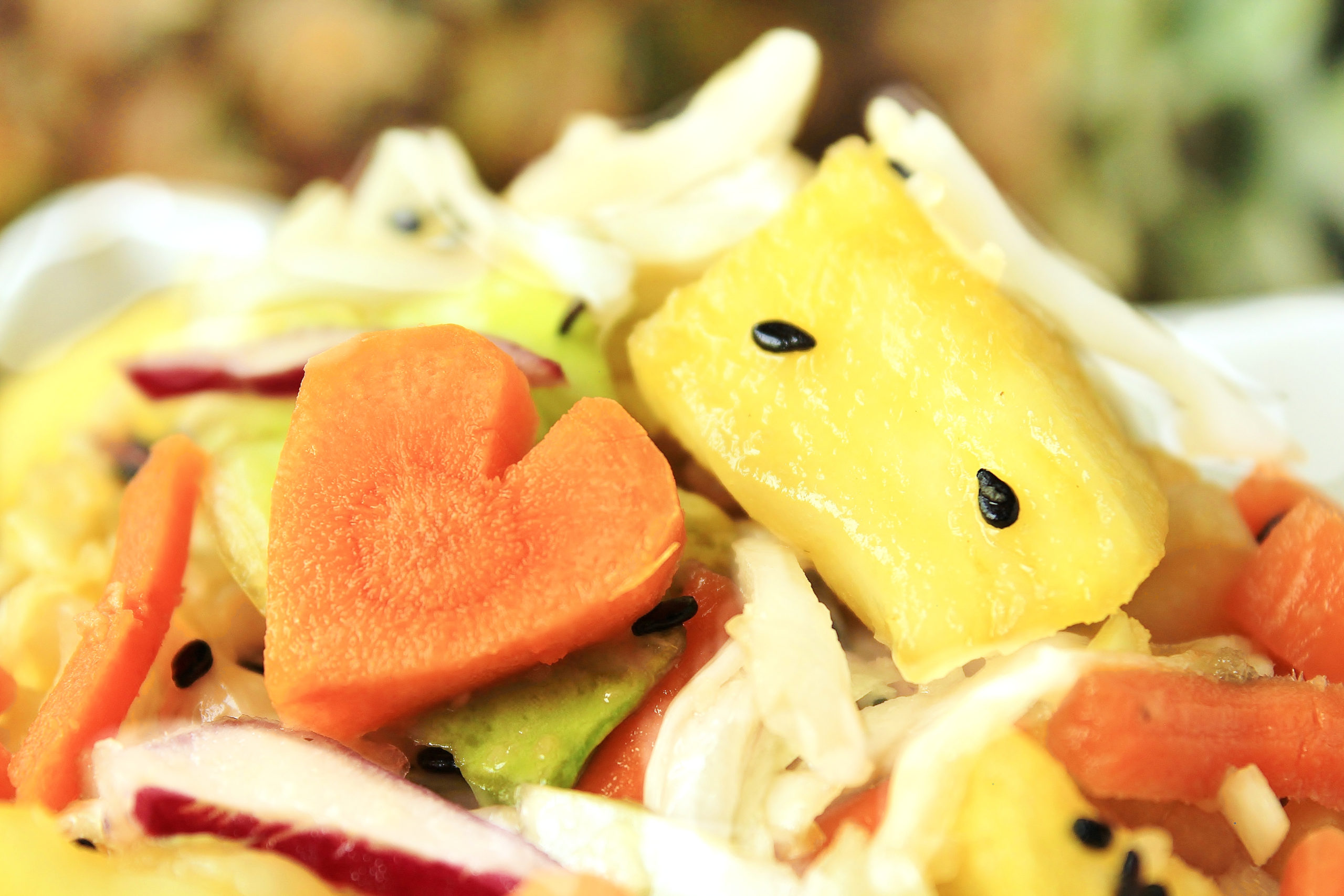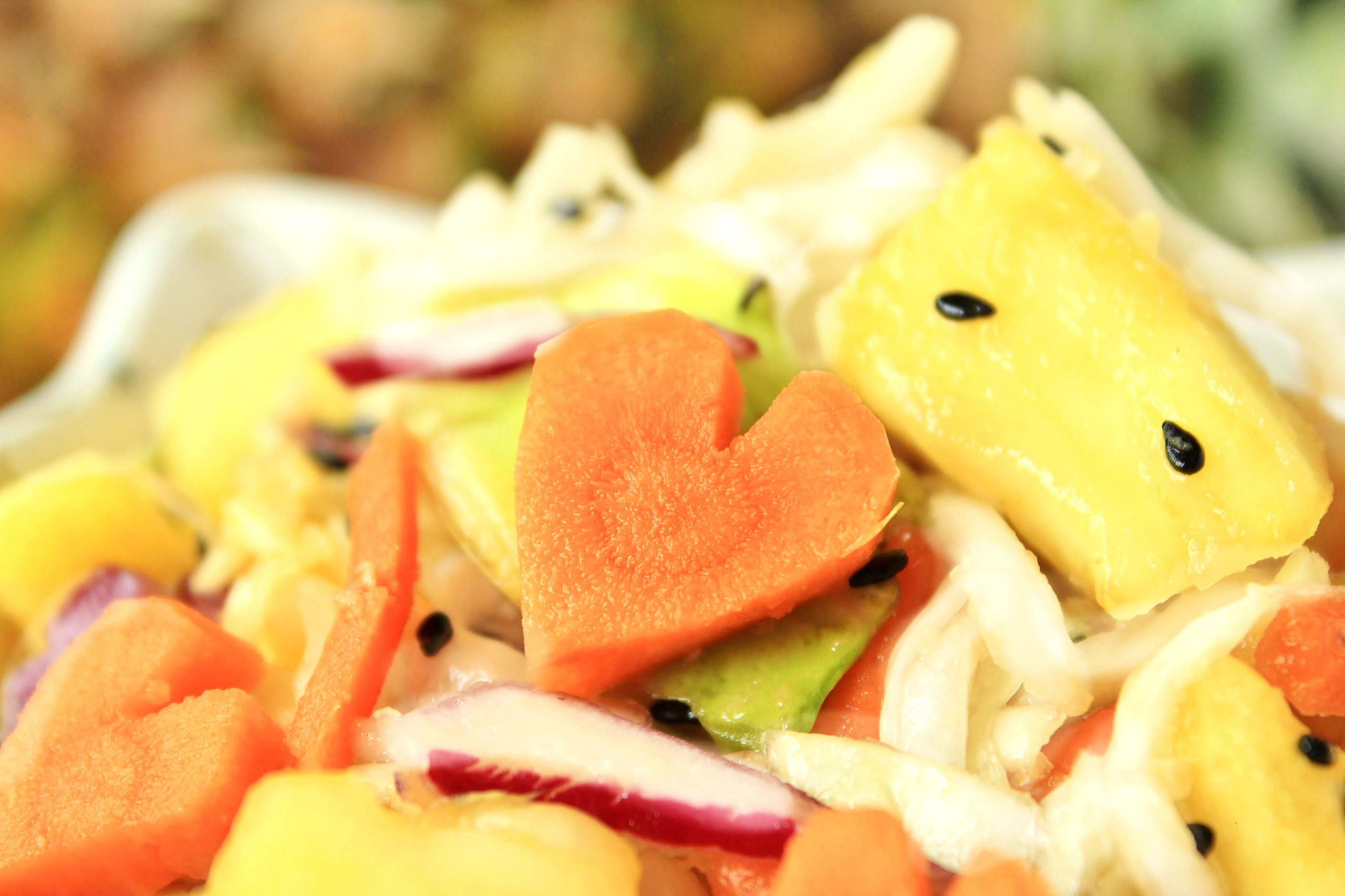 - FOR THE SLAW. In a medium bowl, stir together the slaw mix and pineapple. To make the carrot hearts, peel a medium carrot and cut a small angular wedge out of the top. Cut the sides at a downward angle so they meet at a point at the bottom. Along the top on either side of the wedge, use small rotating cuts to create a curve to create the two bumps at the top of the heart. Cut width-wise into small hearts. You can also fine-tune the bumps after you have the individual pieces (it’s easier than doing it with one long carrot, but it takes longer). Stir the hearts into the bowl.