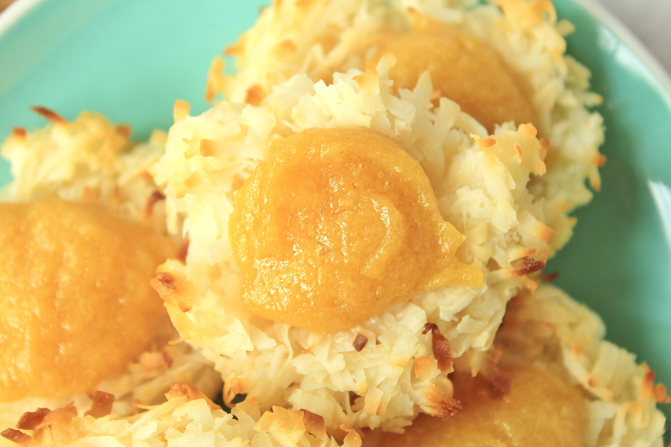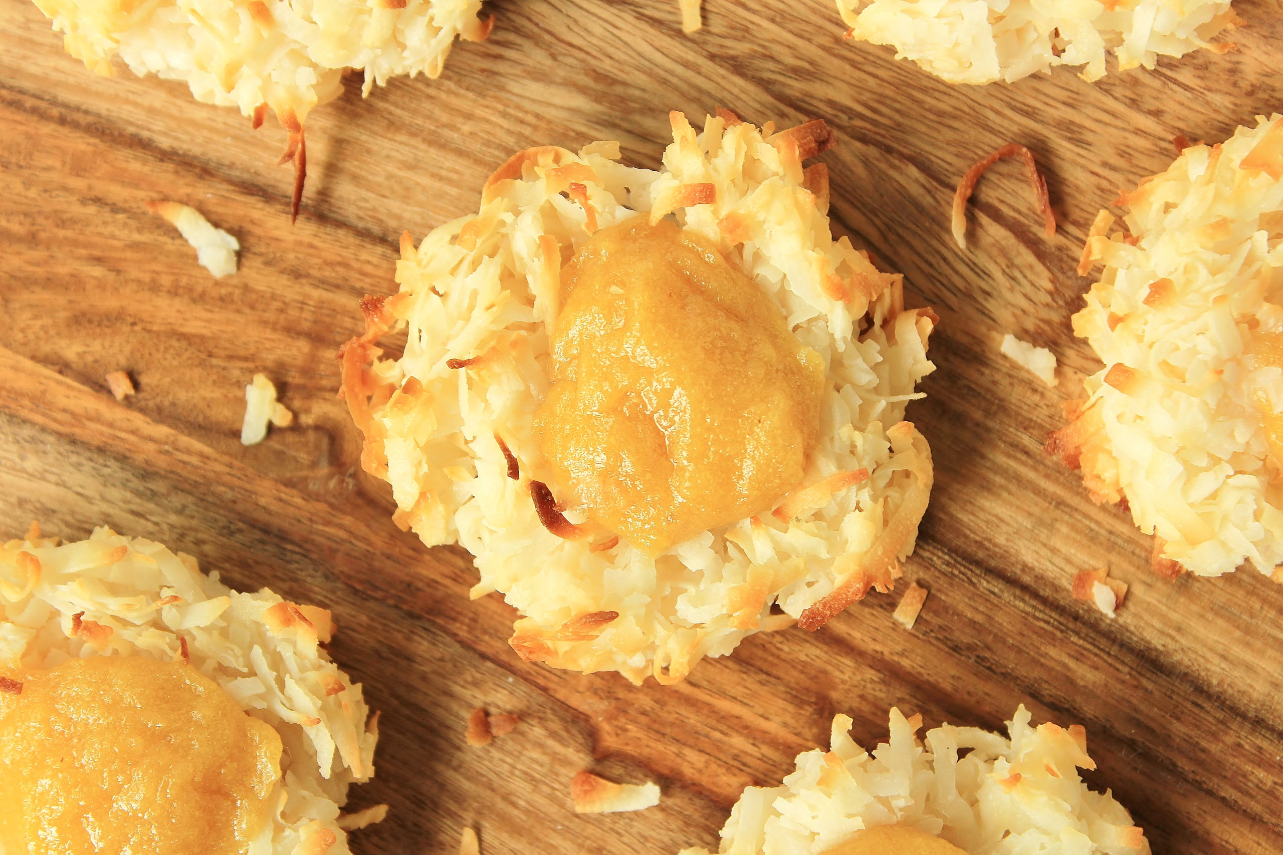But what to pair with it? That was easy: coconut. In the book, coconuts are mentioned no less than 36 times! Such a prominent ingredient simply HAD to be in my dessert, so I decided to make coconut macaroons and turn them into little guava thumbprint cookies. I used this macaroon recipe from The Slow Roasted Italian as my jumping off point, then started riffing from there.