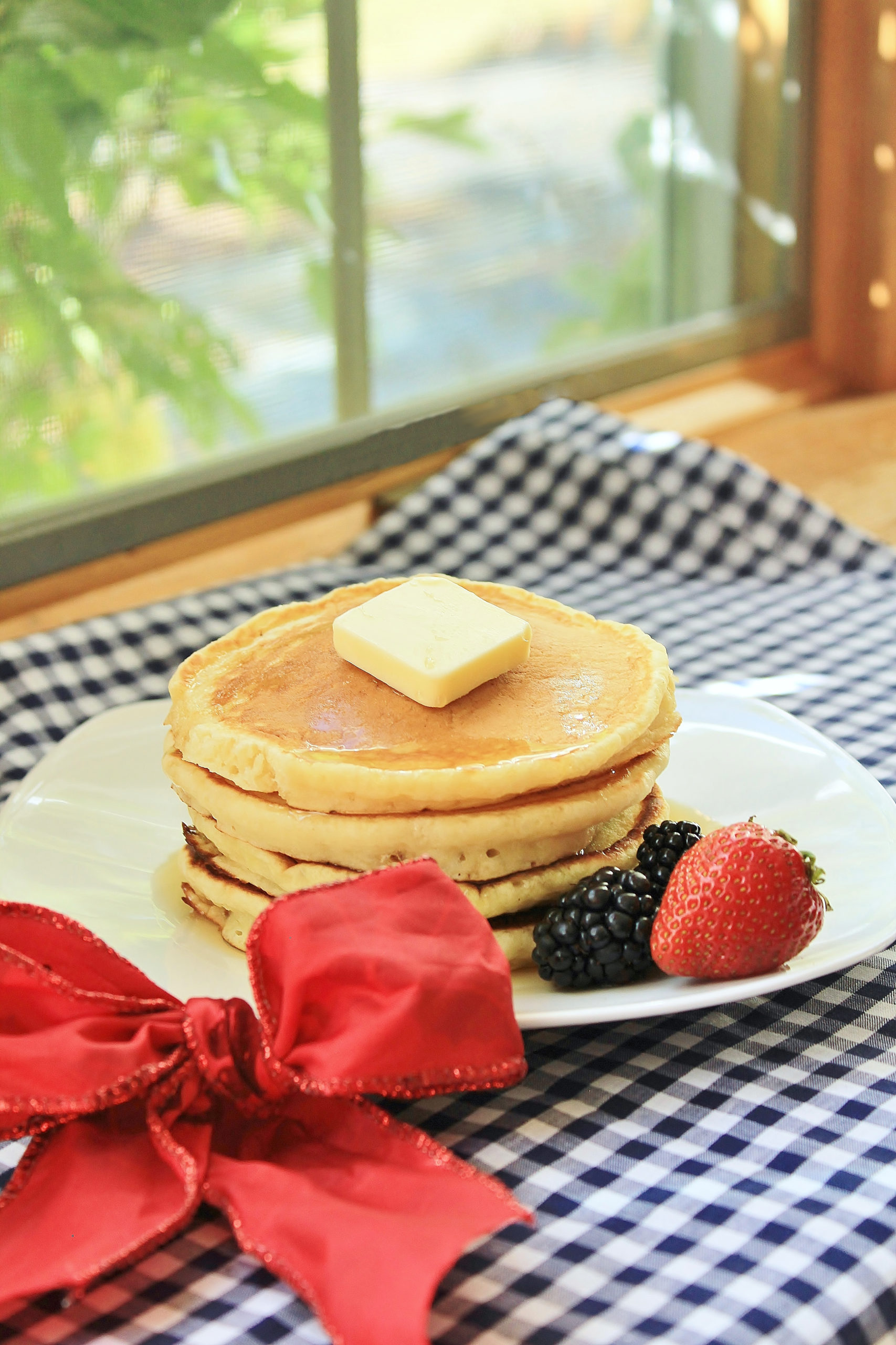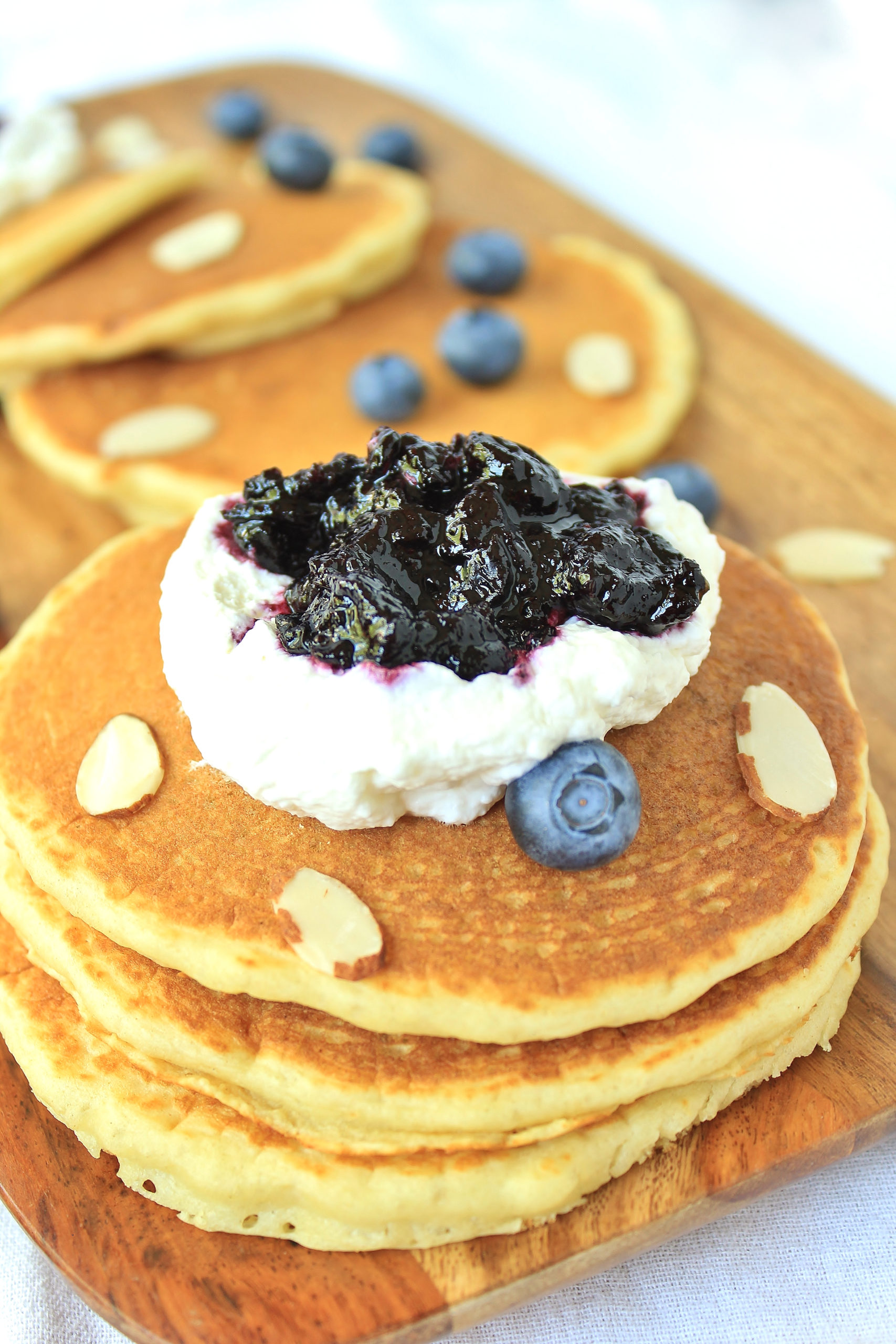 The blueberry jam was a really fun pairing and a perfect way to take advantage of summer fruit. I’m not big into syrup on my pancakes, so I appreciated the change of pace. Add some fresh whipped cream and sliced almonds on top, and you’ve got yourself the perfect recipe to finish off a menu for MY SIDE OF THE MOUNTAIN. See you all again in September!