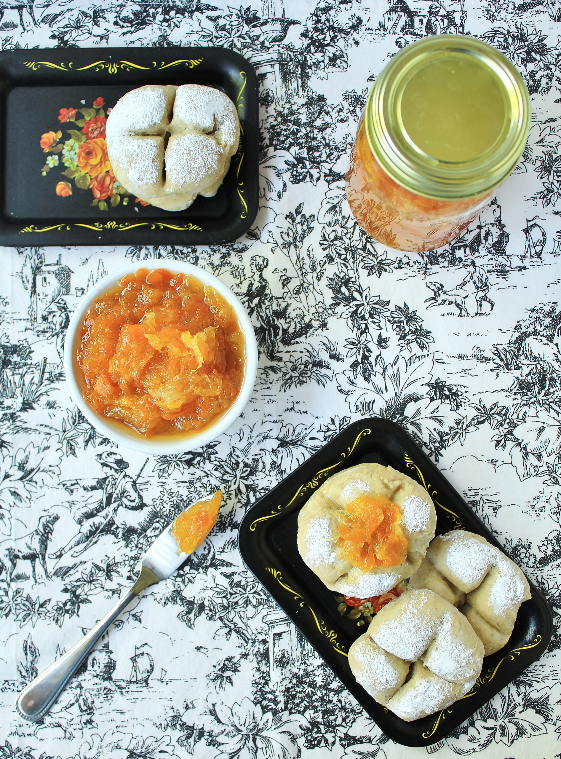 As for the marmalade that accompanied Stephen’s buns, I used a slightly tweaked version of a recipe I found on Mon Petit Four, since I’d never made marmalade before. I love this recipe because it’s super easy to follow, doesn’t use a lot of ingredients, and successfully avoids the bitterness that can happen in homemade marmalade. It takes a couple hours, but a lot of that time is spent waiting for things to boil. Plus, it’s easy to scale up without much added cook time. It was super delicious, I’ll definitely make it again. Enjoy! 😀