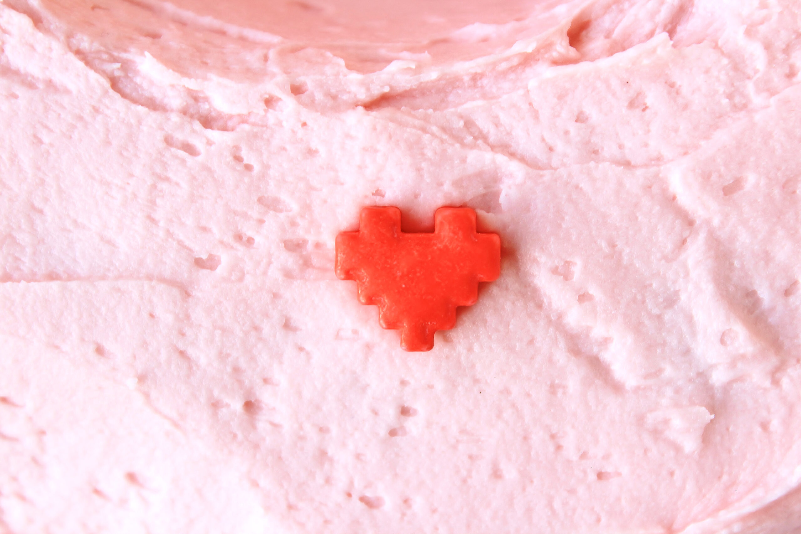 - FOR THE FROSTING. Whisk the food coloring thoroughly into the milk with a fork and set aside. In the bowl of standing mixer, beat the butter on medium speed until smooth. Beat in 1 cup powdered sugar until combined. Beat in the vanilla and 1 Tbsp milk until combined, stopping to scrape the sides of the bowl if needed. Alternate beating in remaining powdered sugar and milk until fully combined, stopping to scrape if needed. Spread the frosting onto the cooled cake in an even layer. Top with large pixelated heart sprinkles.