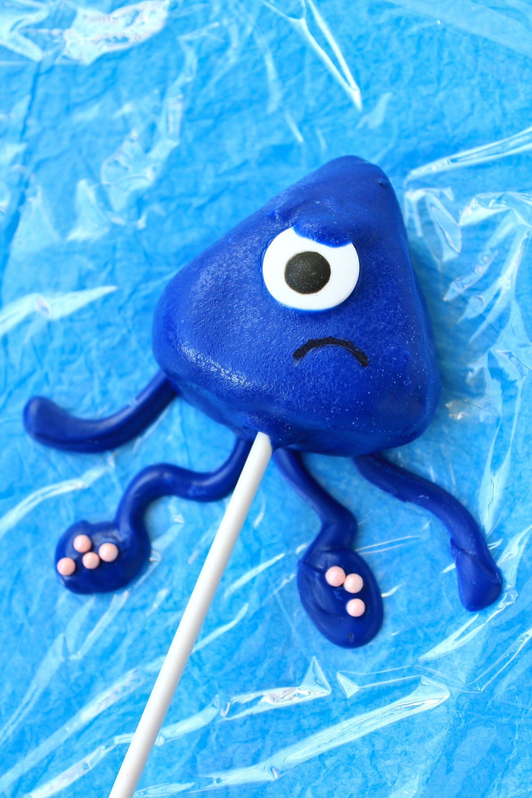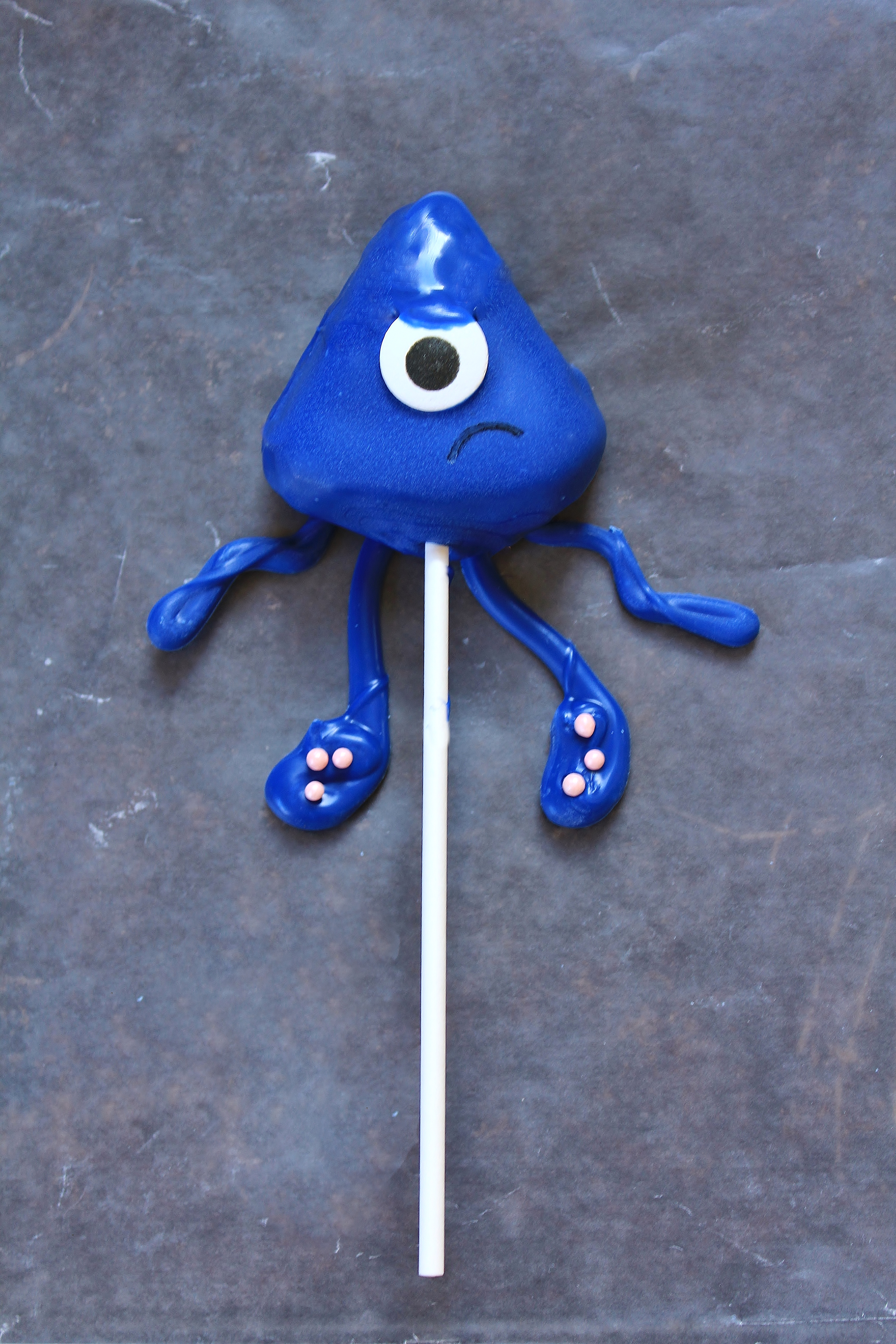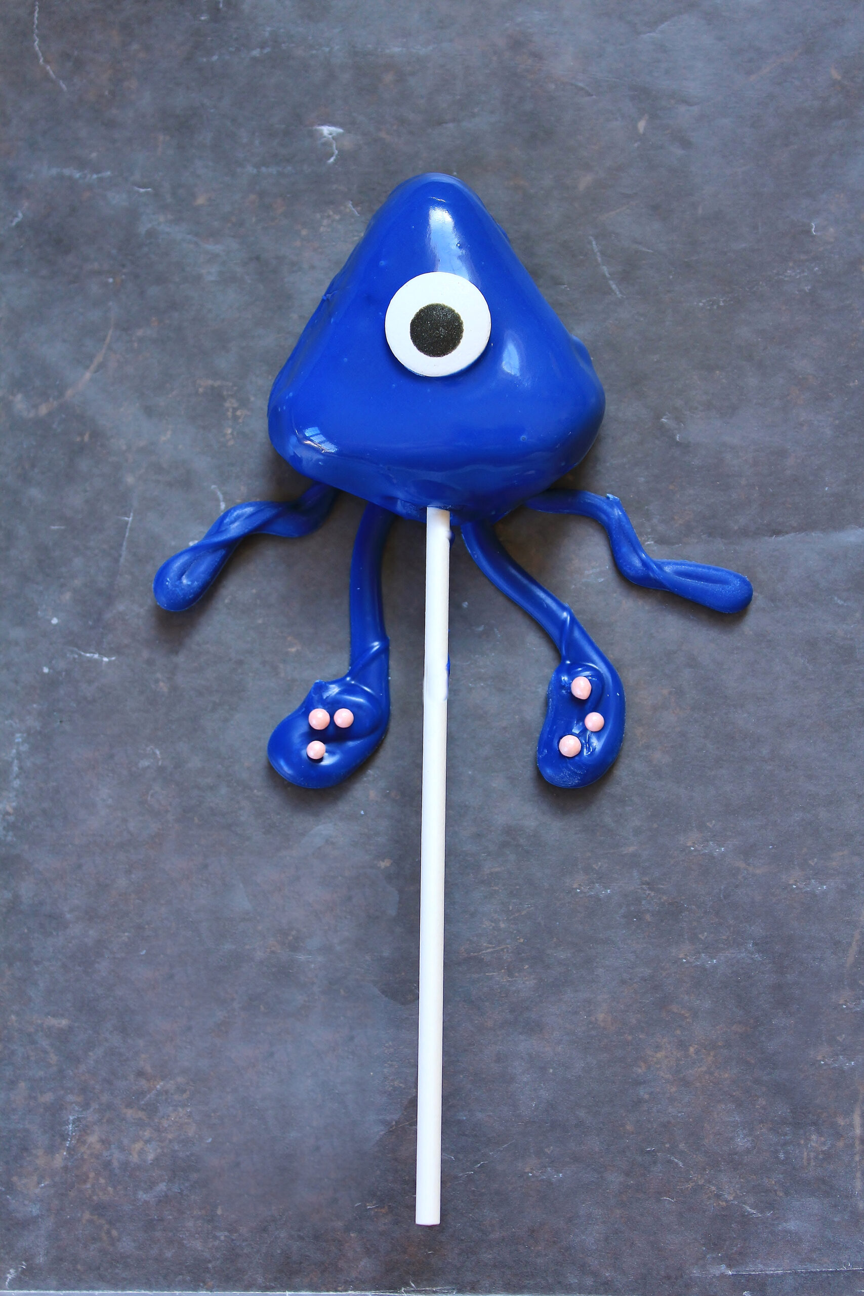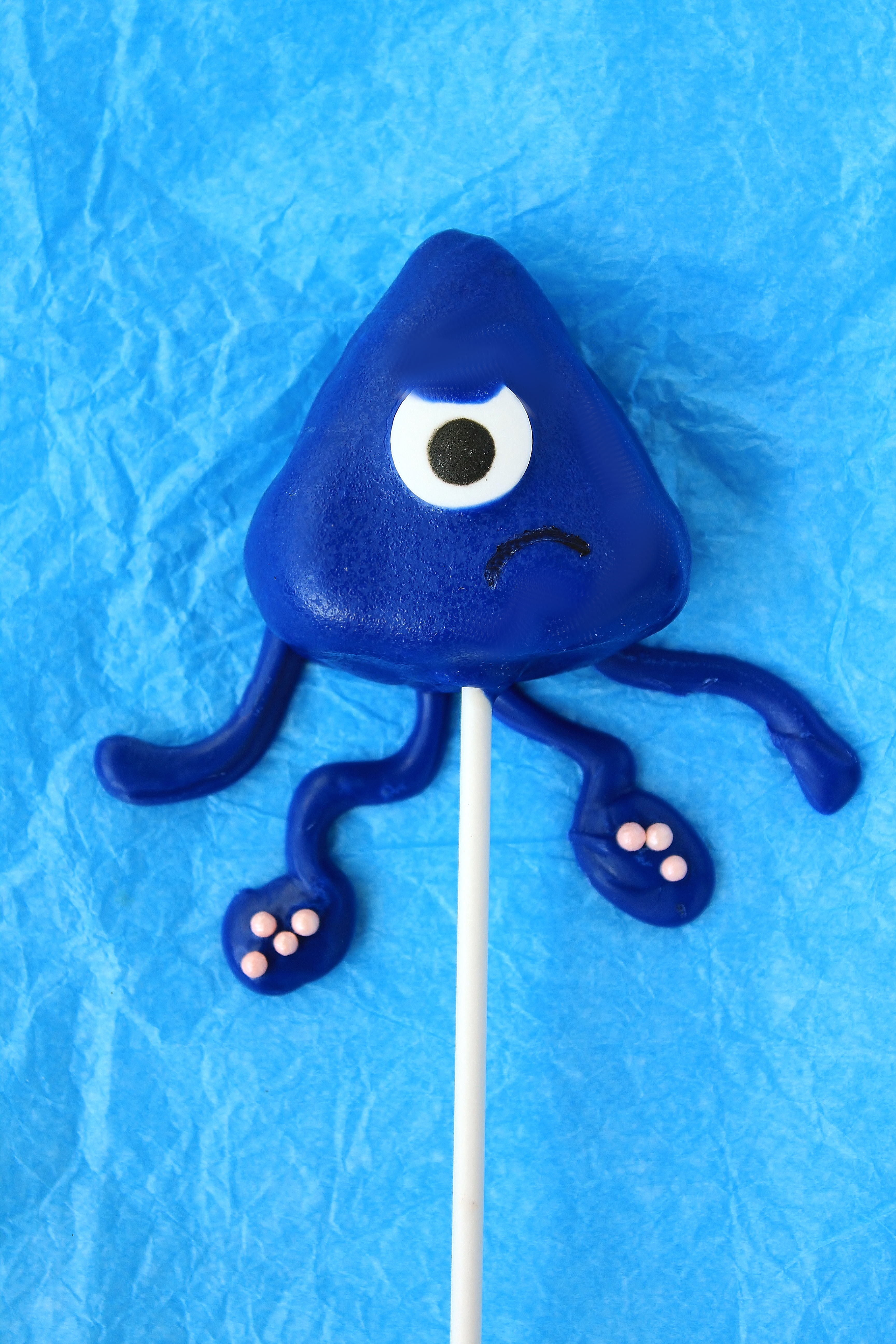 - Submerge a cake pop in the candy and remove. Hold it over the mug for a minute or so to let the excess drip off. To speed up the process and avoid cake pops softening and breaking, I recommend lightly scraping the bottom and sides of the cake pop with a chopstick or extra cake pop stick. Place the coated cake pop on top of a set of tentacles so that 1-2 inches of tentacle are visible underneath the body of the squid. Place a candy eye in the center of the squid body. If desired, use a chopstick or cake pop stick to dab extra candy melt over the top of the eye to create a partially lowered eyelid to make the squid scowl.