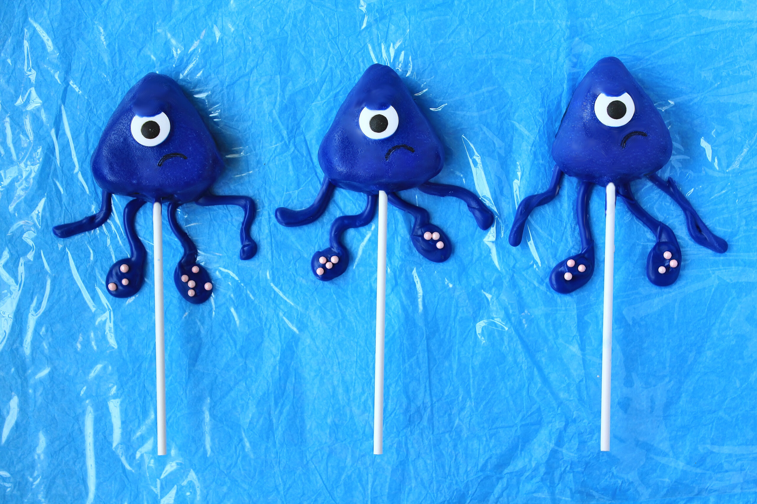 And here it is! Say hello to the cutest, sweetest, angriest squids you’ve ever met. These grumpy little guys are stylized versions of giant squids because I like the juxtaposition of a cute yet dangerous sea monster. These squids are blue since it makes the “suckers” on the tentacles more visible, and I had loads of blue candy melts left over from a previous recipe. I also had giant candy eyeballs left over from my other ocean-themed dessert, Colonel Brandon’s Curse Cupcakes. Which also happens to feature a too-adorable-to-be-scary sea monster.