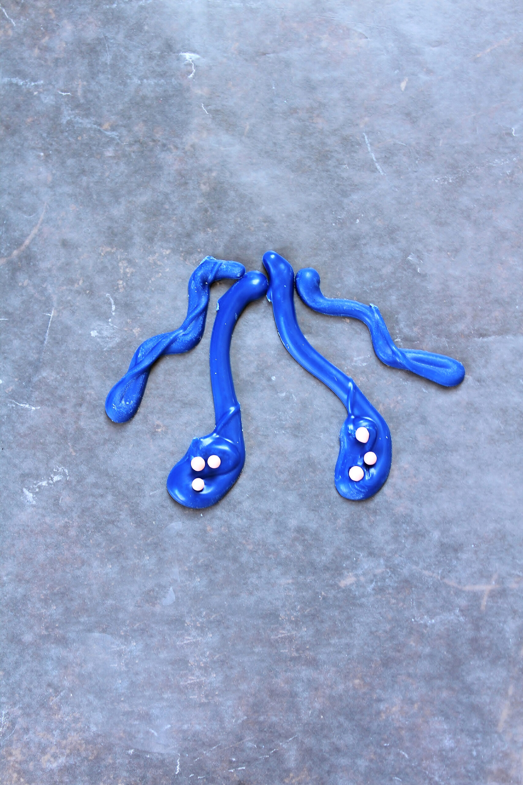 - While the dough chills, melt 4 oz blue candy melts according to package instructions and transfer to a piping bag either fitted with a small round piping tip or cut to create a small, round opening. On one sheet of wax paper (this can be placed on a baking sheet for easy moving if desired), pipe 26 squiggles about 2 inches long. On another sheet of wax paper, pipe 26 squiggles about 3 inches long with an oblong dollop at the bottom about 1/2-inch long. On each of these dollops, add a few pink pearl sprinkles.