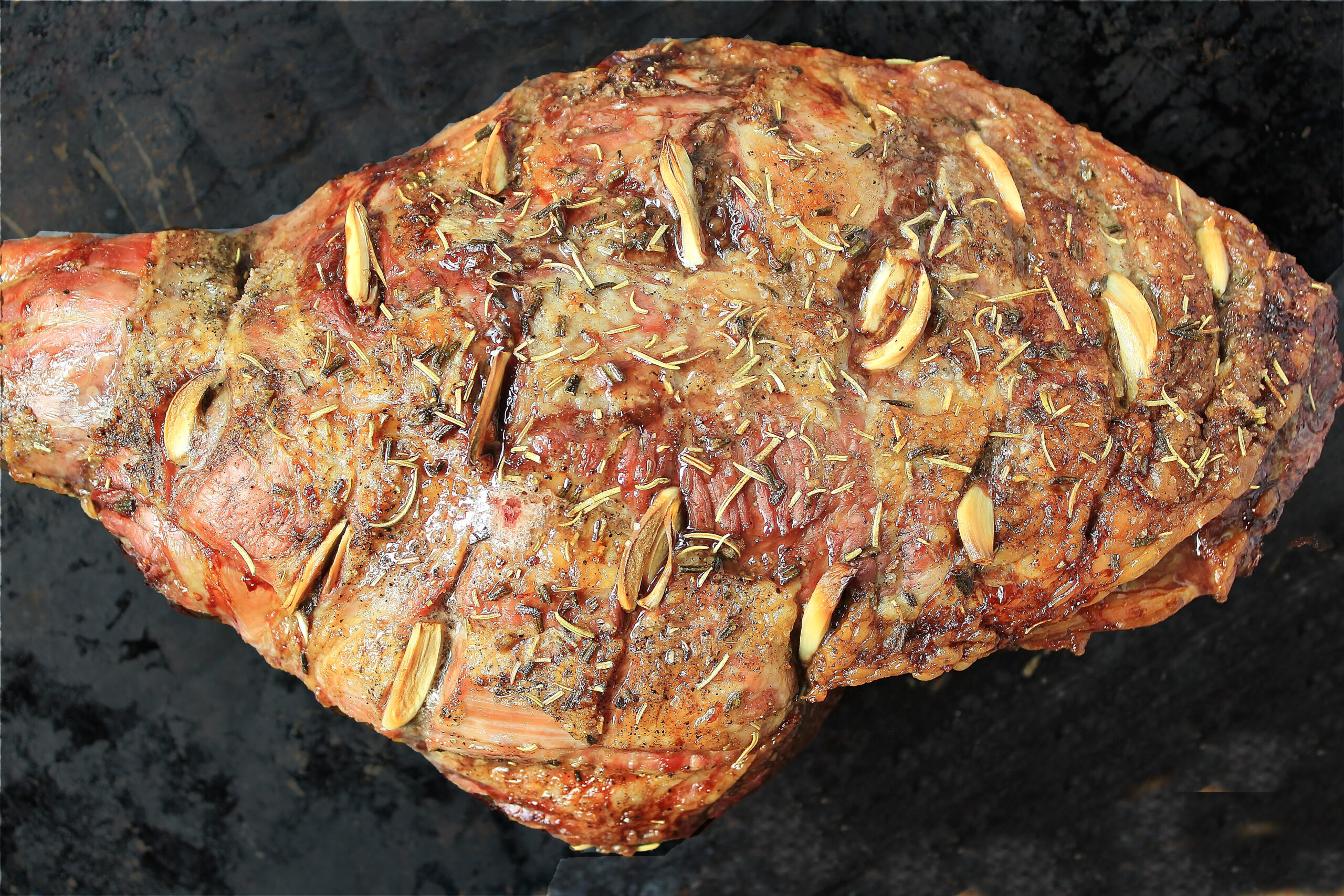 - Preheat oven to 350°F. Line a roasting pan with foil. Pat the lamb dry with a paper towel. Place the lamb fat side up on a rack in the roasting pan. With a sharp knife, score the top half of the lamb in a diamond pattern, using shallow cuts. In a small bowl, whisk together the rosemary (both fresh and dried), salt, and pepper. Rub the lamb all over with the rosemary mix. Cut deeper pockets into the lamb and stuff with the garlic slices.