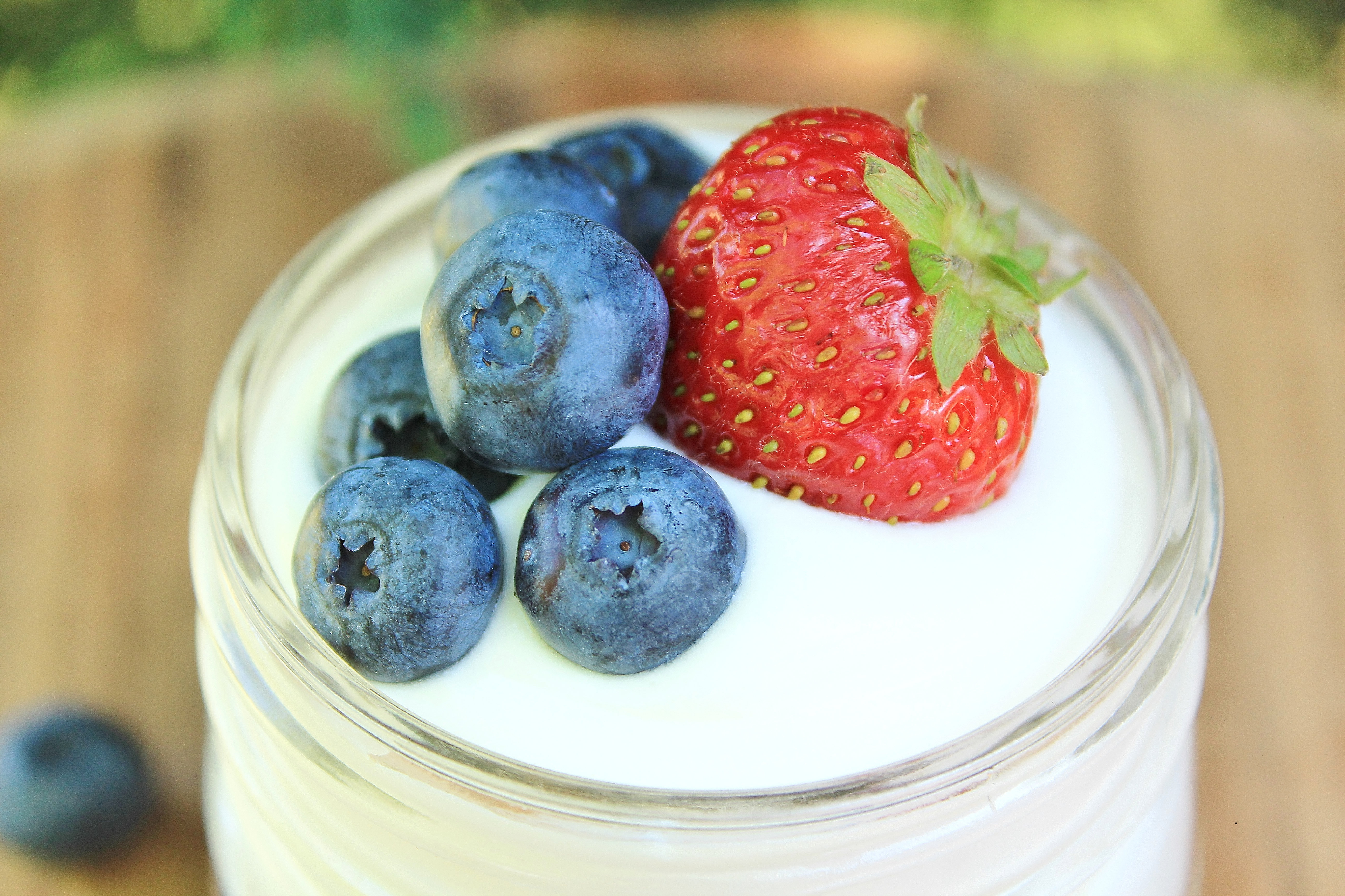 - In a squat 8 oz glass or jar, layer 1/4 – 1/3 cup cream and 2 – 3 Tbsp berries. Add another layer of cream. Top each glass with a whole strawberry and a few blueberries.