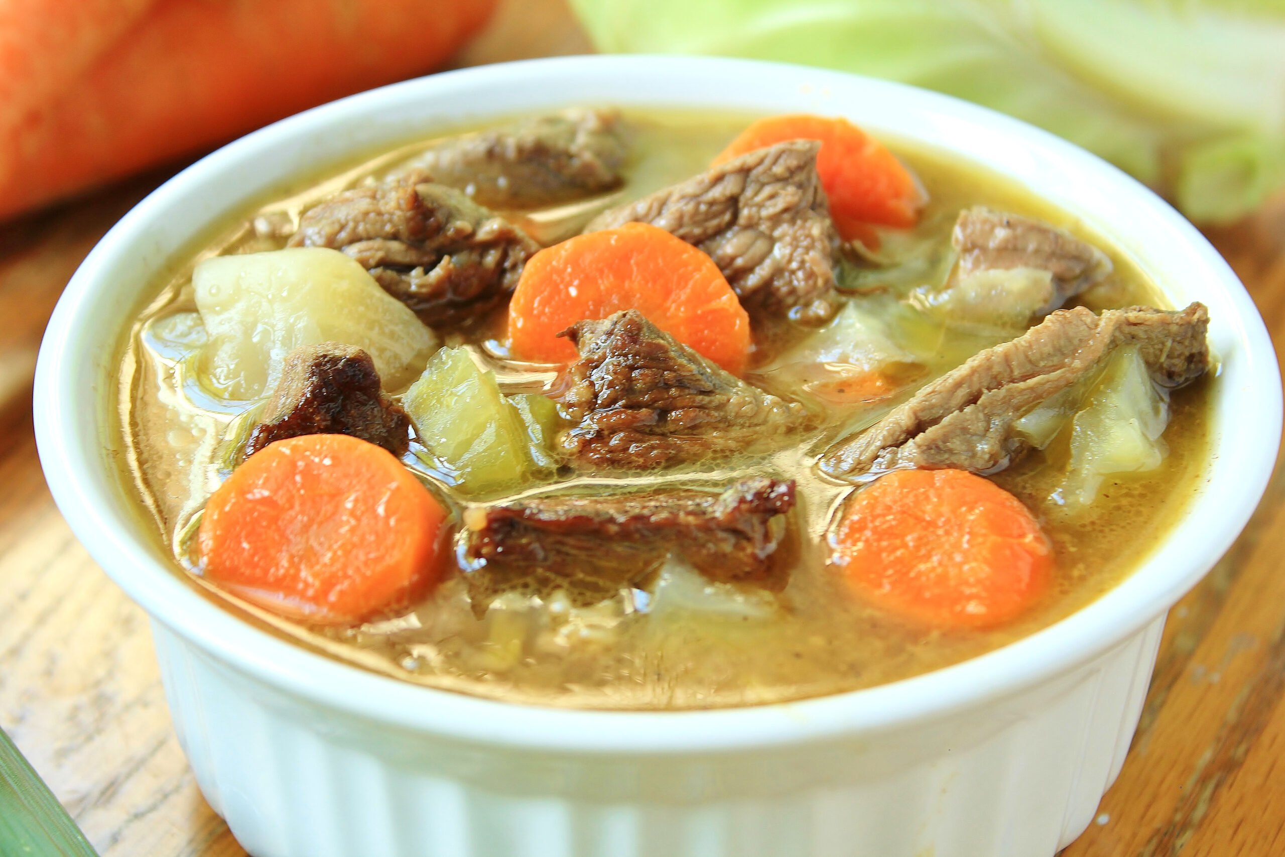 Since the story is set in Norway, I made a stew inspired by fårikål, Norwegian lamb and cabbage stew. However, what we’re making today isn’t true fårikål, which consists almost exclusively of lamb, cabbage, and seasoning. For one thing, my stew uses beef, since none of my local grocery stores have lamb on hand at the moment. I also added some extra ingredients, drawing inspiration from the groceries Emily picks up at the supply shop: carrots, leeks, and cabbage.