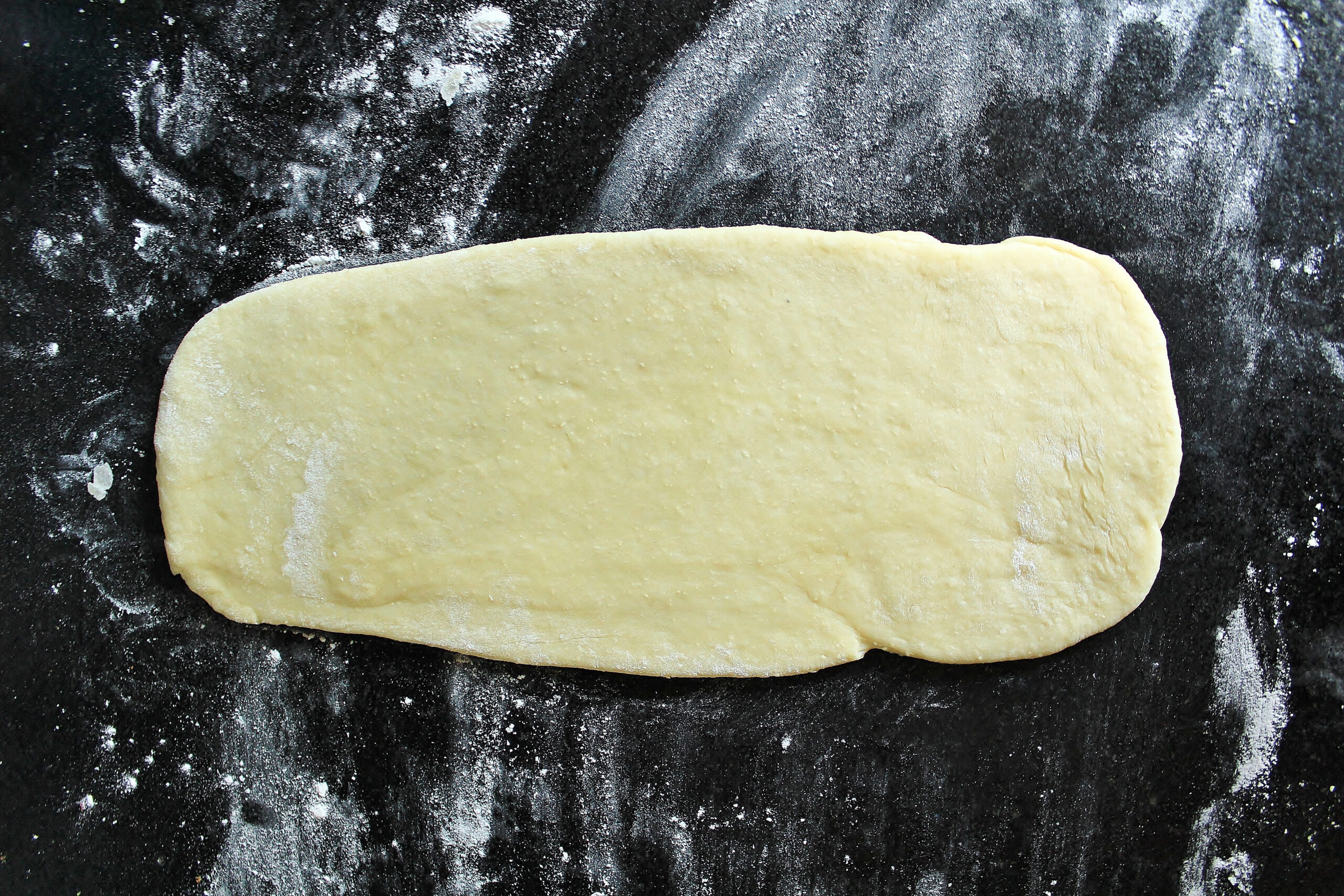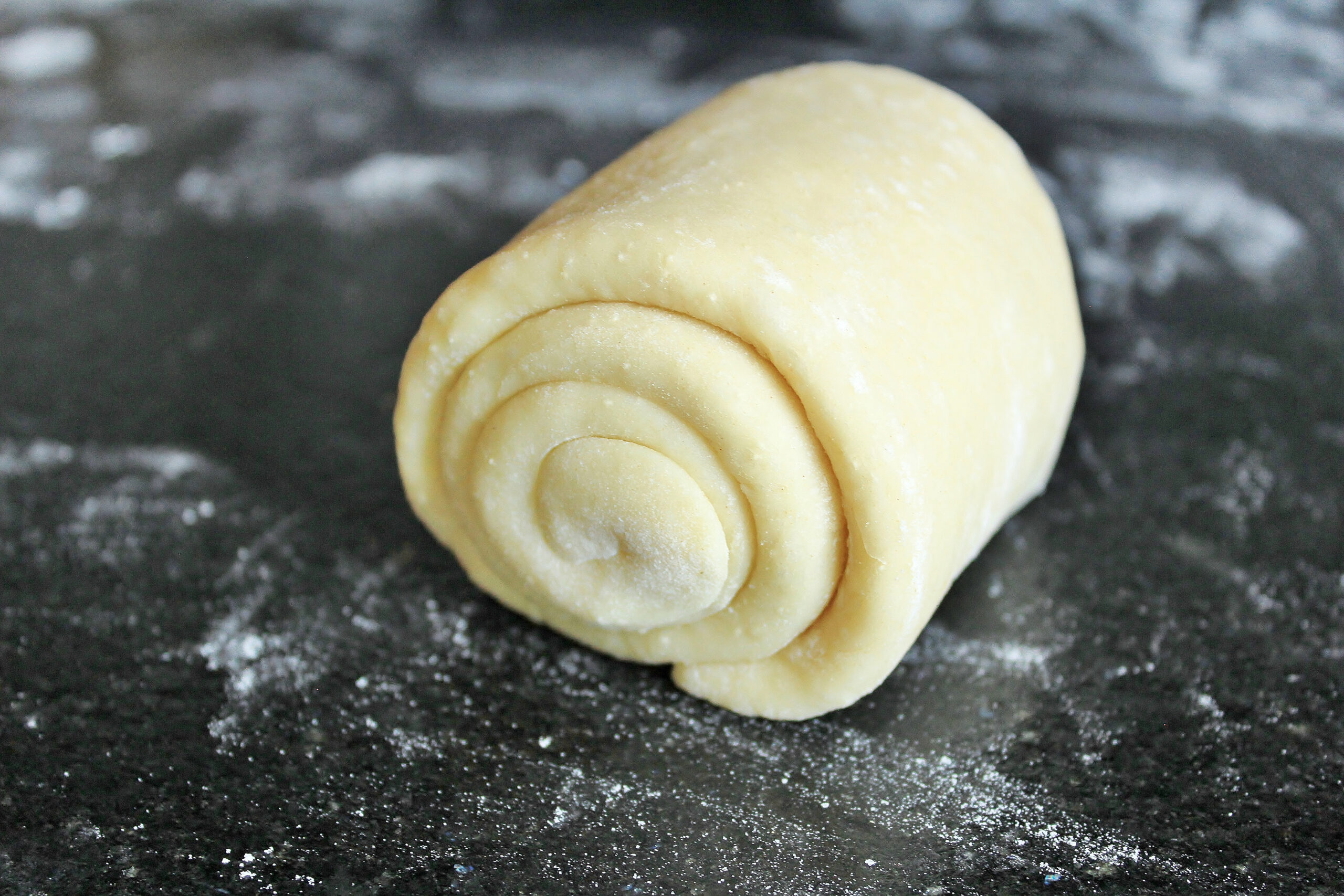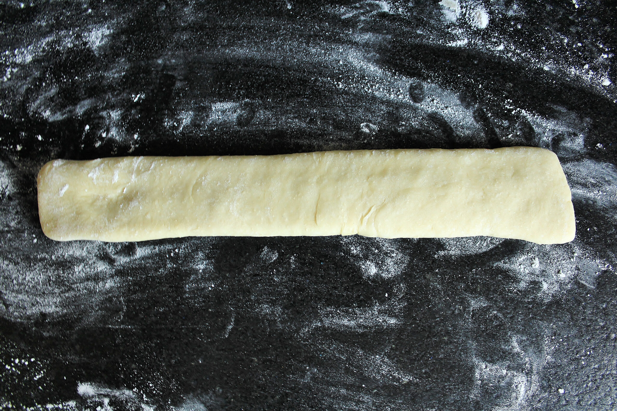 - Line a 9-inch loaf pan with parchment paper. Taking one half of the dough, cut it into 3 equal portions (approx. 194 grams each). Take one portion, roll it into a 12″ x 5″ rectangle. Fold it into thirds lengthwise. Flip seam side down. Roll to 15″ x 3″. Flip seam side up. Starting at the short end, roll up tightly like a sleeping bag. Lay seam side down in one of the prepared loaf pans. Roll remaining 2 portions and place them in the loaf pan alongside the first.