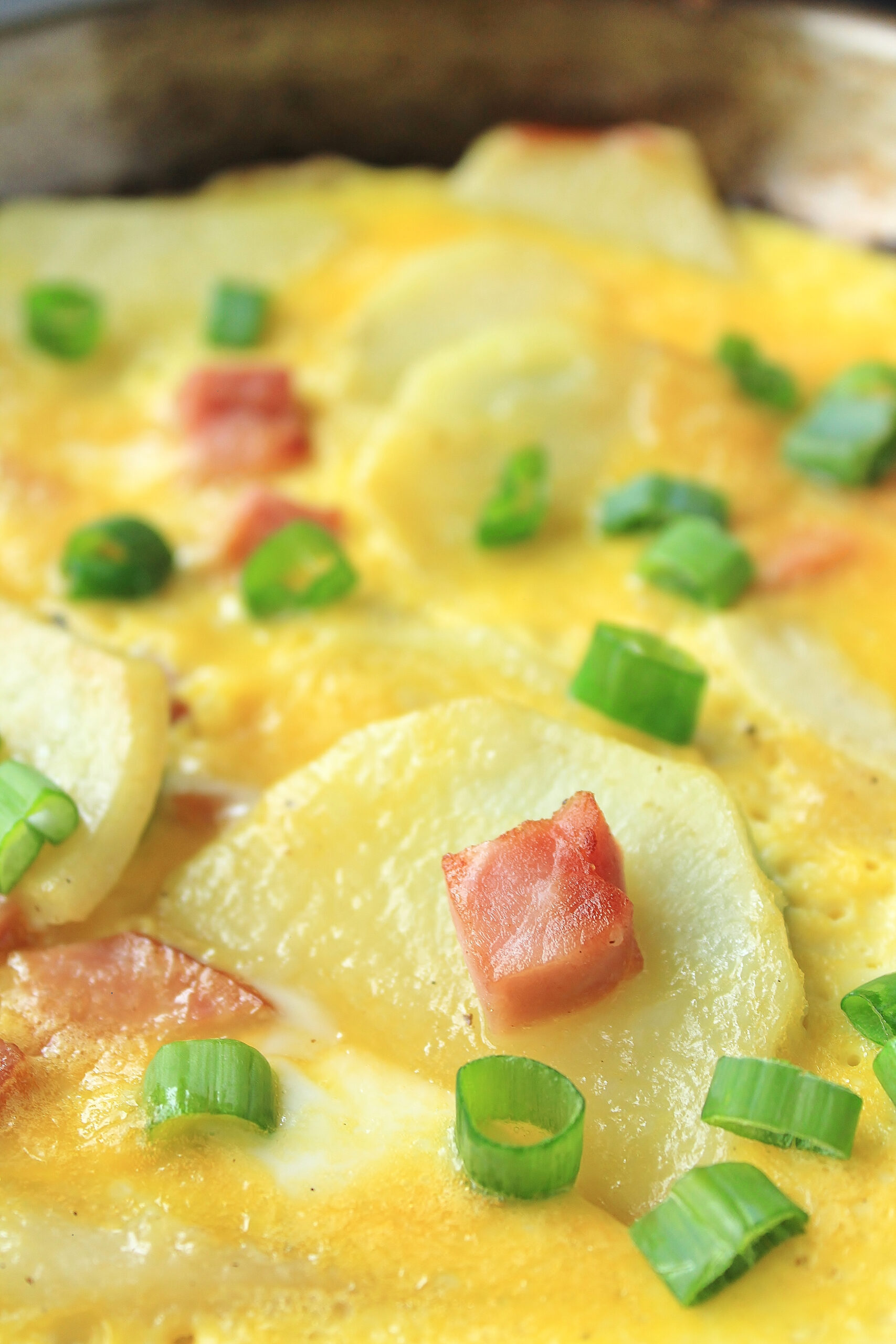 - Heat oil in an 8-inch skillet over medium-low heat. Add the potato and onions, stirring to coat. Add the ham, salt, and pepper, and cook until potatoes are tender (approx. 15 minutes), stirring regularly. Pour the eggs into the pan. Cover and cook for 5 minutes, swirling the pan occasionally, until the eggs are mostly cooked through. Remove from heat. Keep covered and allow to rest for 2 minutes or until the top is fully set. Sprinkle on green onion.