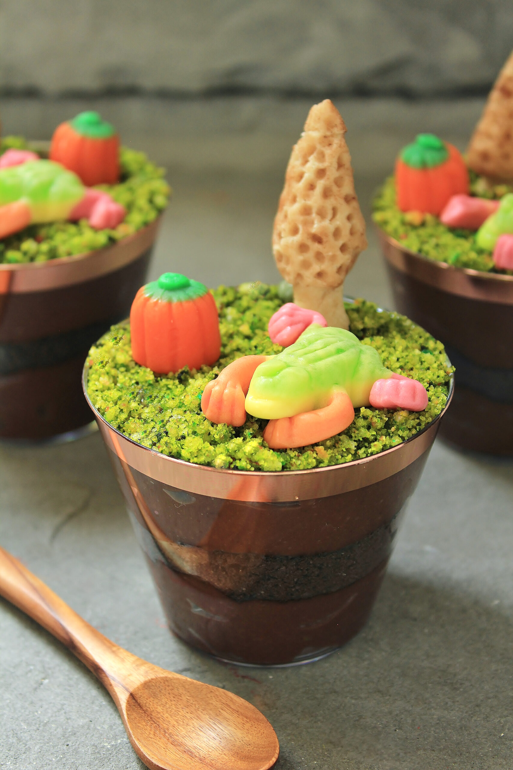 - FOR ASSEMBLY. In 4 9-oz clear plastic cups, layer 1/2 cup pudding, 3 Tbsp crushed Oreos, and 1/2 cup pudding again. Top each with 1-2 Tbsp green cupcake crumbles and spread until flat. Insert a toothpick about halfway through the bottom of each morel (this will help it stand better). Finish the top of each pudding cup with a marzipan morel, frog gummy, pumpkin candy.
