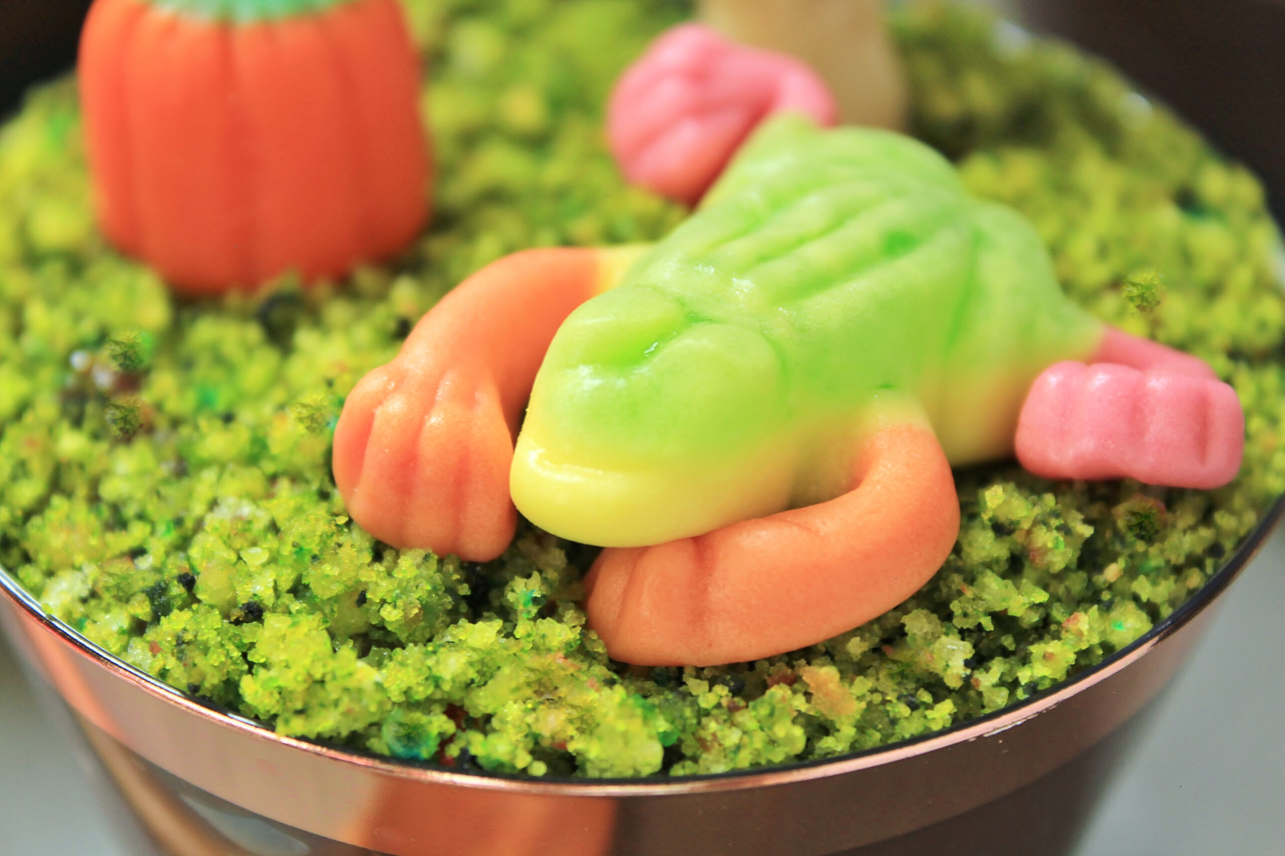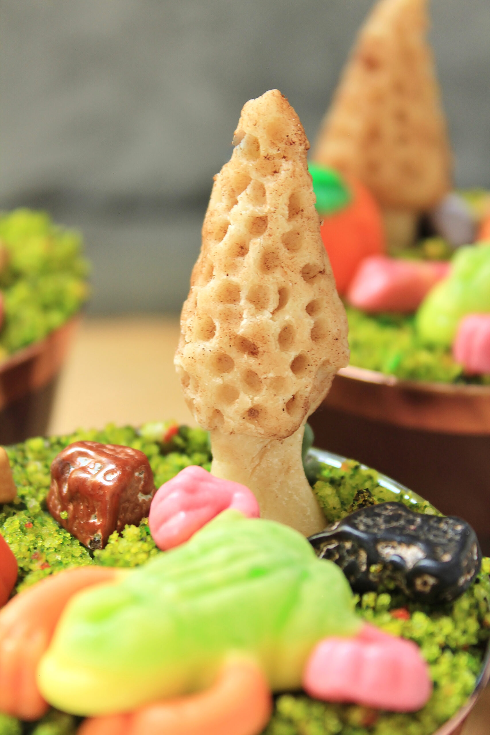 Instead of topping the cups with gummy worms, I decided to decorate them with stuff from the show: gummy frogs and candy pumpkins! Originally I did chocolate rocks too, but I decided they made it all look too busy in the pictures (you can definitely add the chocolate rocks to yours though!). To make the top of the pudding cups look more like the forest floor of the Unknown, I added a bed of edible moss and some morel mushrooms sculpted from homemade marzipan! I got the idea for the moss from a cake I saw by Must Love Herbs (you should seriously check out all her cakes—they’re sooo beautiful!).
