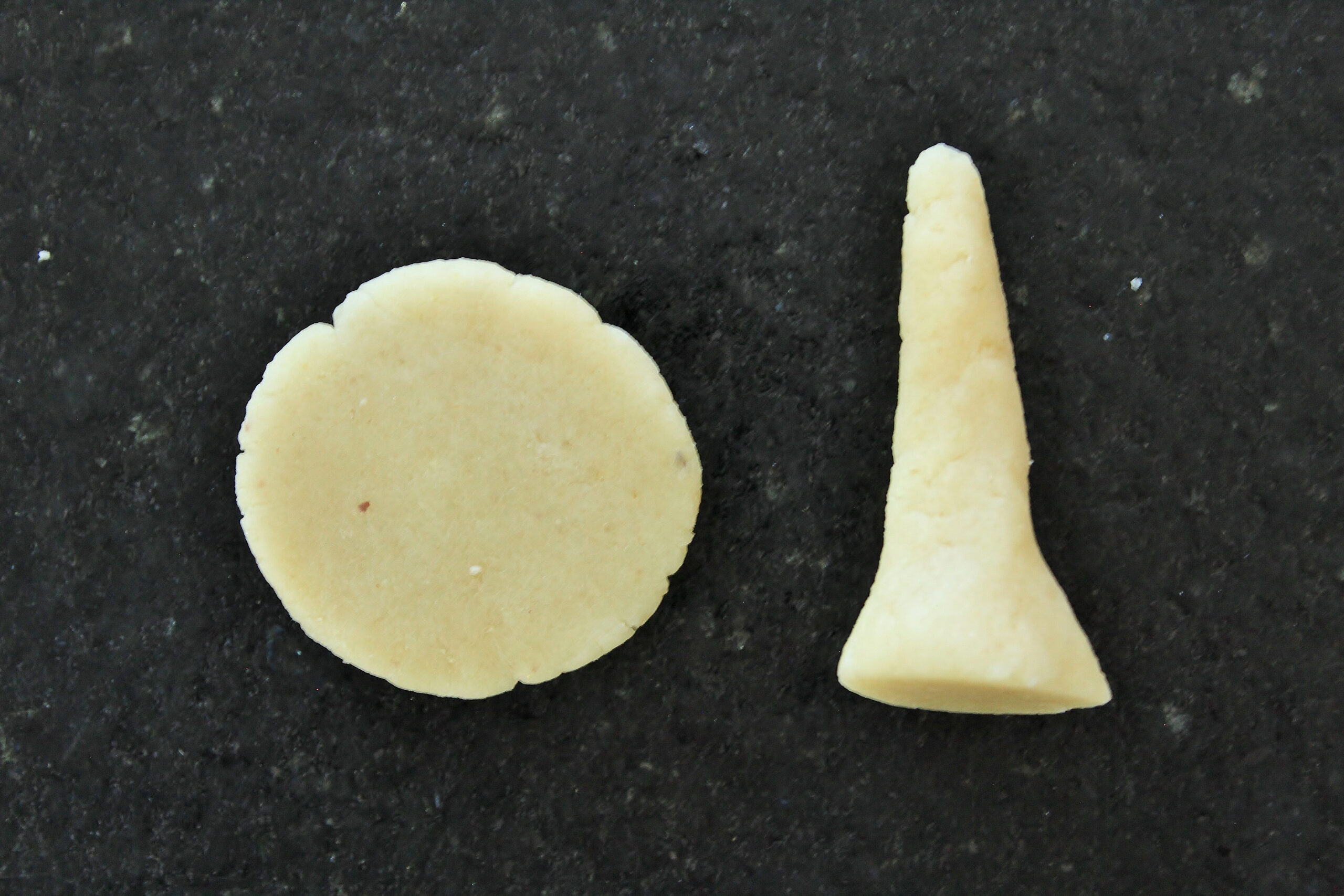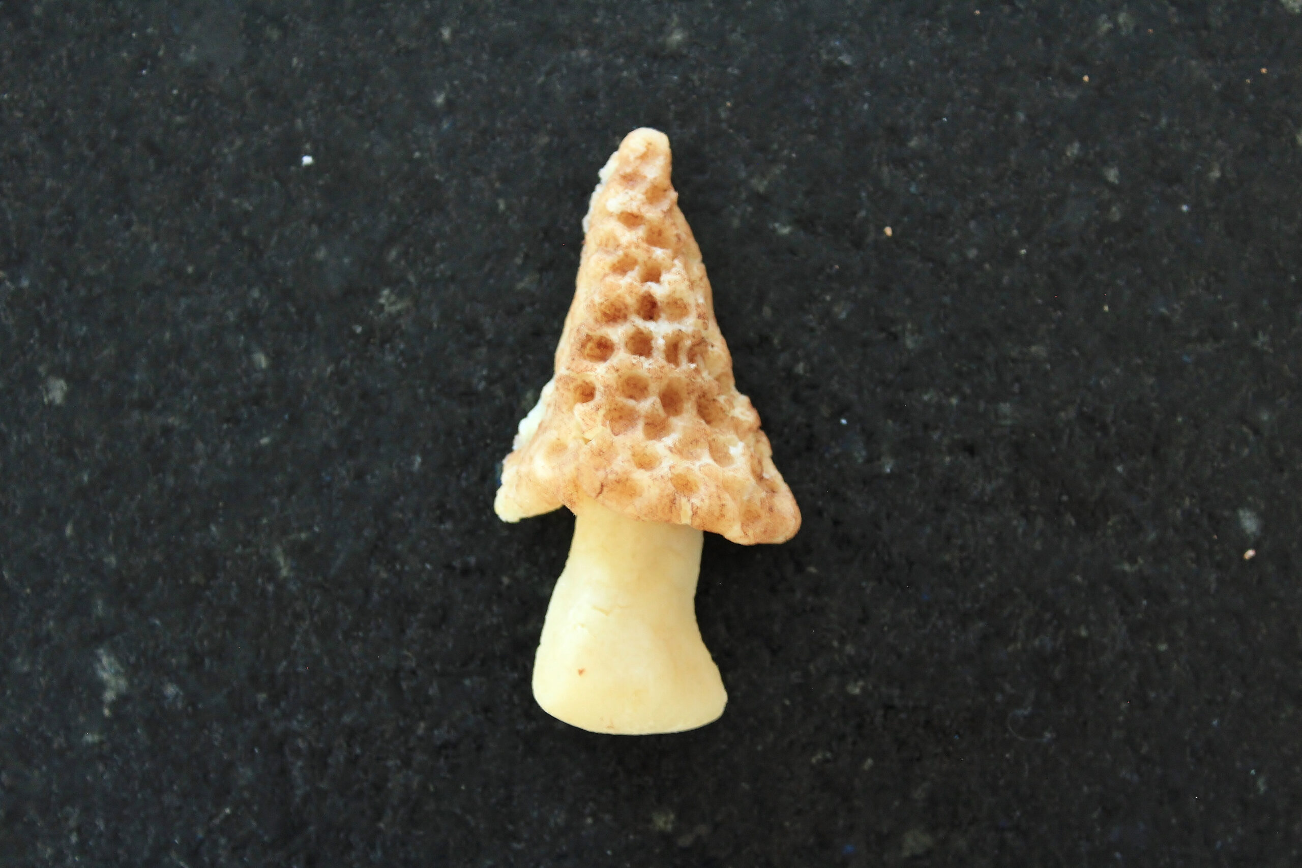 - FOR THE MARZIPAN MORELS. Pulse the almond flour and powdered sugar in a food processor until combined. Add the water, simple syrup, and almond extract. Process on low speed for about 2 minutes or until the mix forms a ball. Knead the ball on a surface dusted with powdered sugar for 1 minute. If mix is too dry and keeps cracking, sprinkle on water a little at a time and knead until mix doesn’t crack but isn’t wet or really sticky. To shape the mushrooms, first pinch off 0.5 oz marzipan and shape into a small ball (approx. 1 3/4 inches wide). Cut ball in half. Flatten 1 half into a 2-inch circle and shape the other into a 2-inch tall narrow pointed cone with a wide base. Place the circle over the top of the cone and flatten the sides of the circle against the cone (if the marzipan cracks, that’s ok. Just press it back together). Shape the dough until is the shape of the tall, narrow mushroom. Using a food brush or the corner of a paper towel, brush the mushroom cap with cocoa powder. Using the tip of a chopstick, poke holes into the mushroom cap (you could also use a toothpick and rotate the toothpick to widen the hole). Repeat until you have 4 morel mushrooms. You will probably have some marzipan left over.
