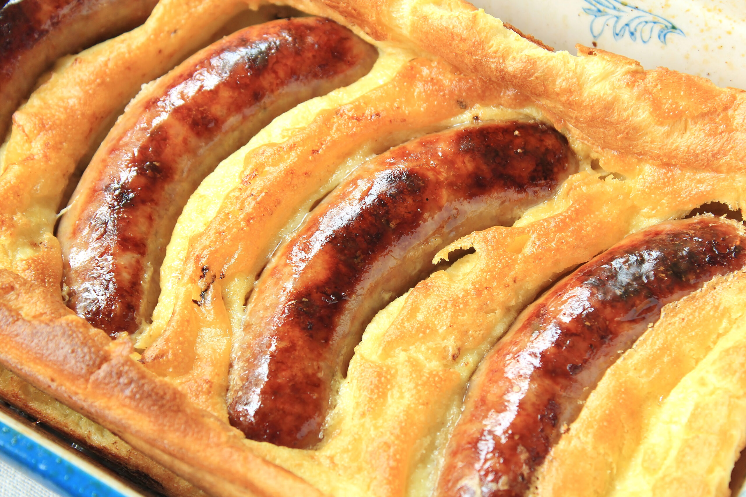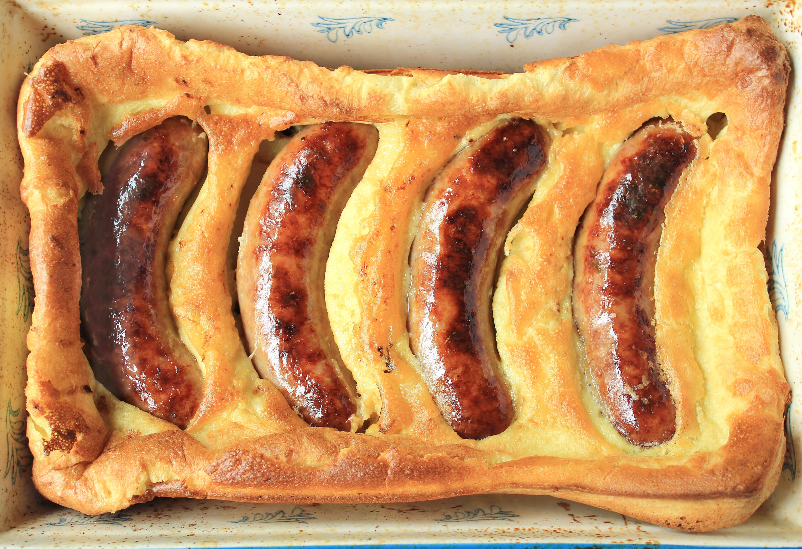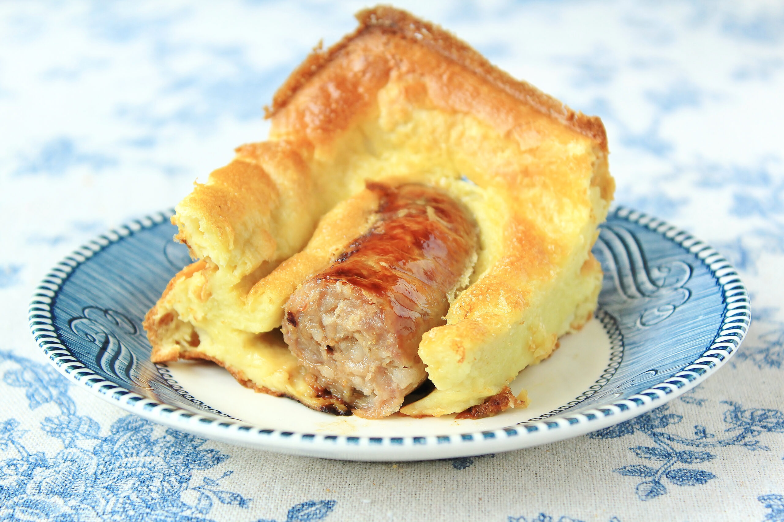 Toad in the hole might look a little intimidating, but it’s actually pretty easy. To start, just whisk some egg, milk, flour, and salt together for your pudding batter. Let it rest in the fridge overnight (that’s the secret to a really eggy Yorkshire pudding). Cook some sausages in a pan in a really hot oven, pour your batter in with the sausages, then it will puff up and get all crispy and delicious. I combined the original Yorkshire pudding recipe I used for my ALL CREATURES GREAT AND SMALL menu with a few tips from Daring Gourmet.