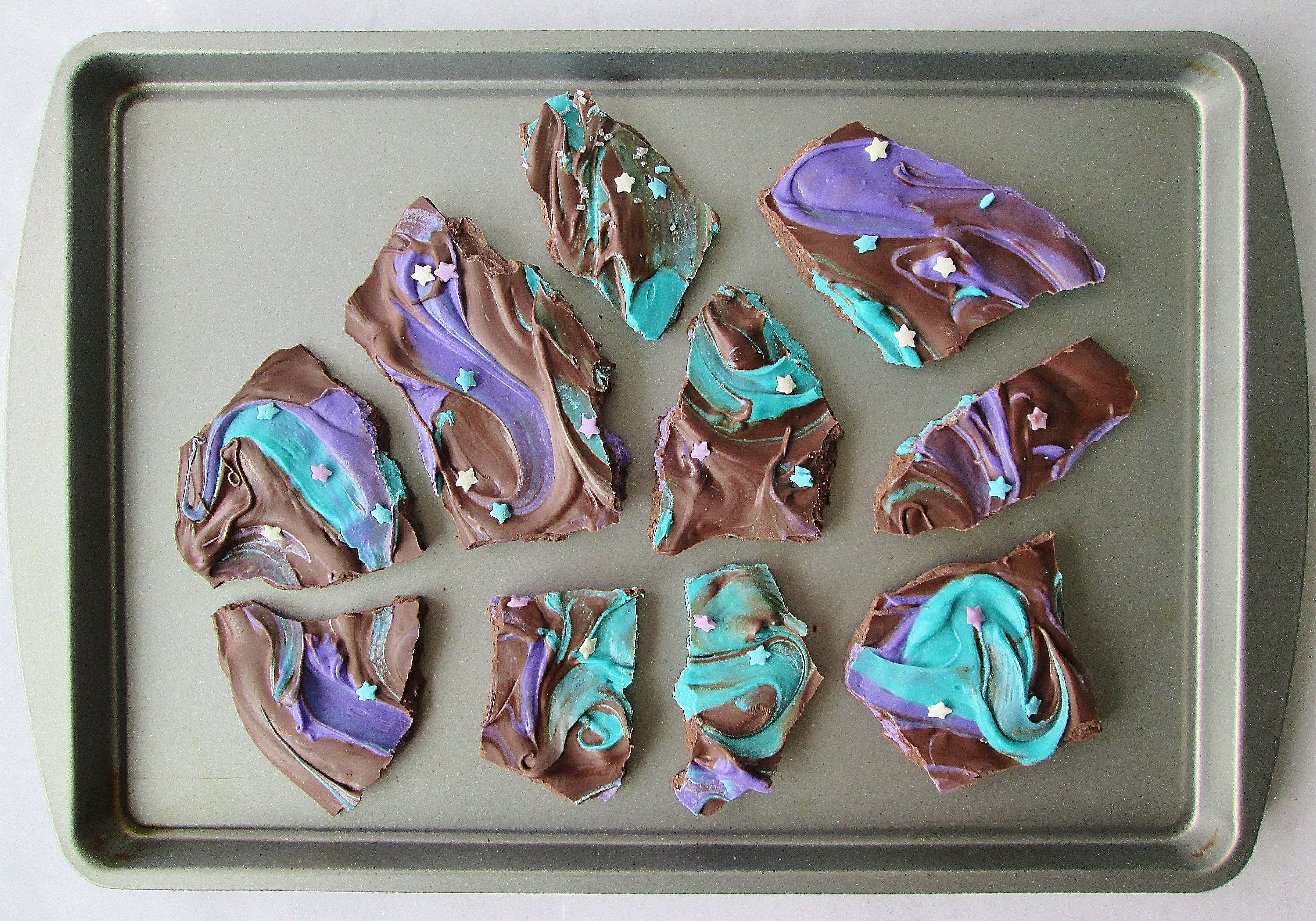 I was really torn as to what to make for our Star Wars bonus recipe. Should I make another molecular gastronomy recipe? A skillet cookie Death Star? Admiral Ackbar’s “It’s a Trap” Wraps? In the end, I decided on this fun, easy Galaxy Bark from Life with the Crust Cut Off. Gotta love those funky colors…and the extra texture element added by the sprinkles! Plus, it’s chocolate, which of course directly translates to SUPER DELICIOUS. Enjoy!